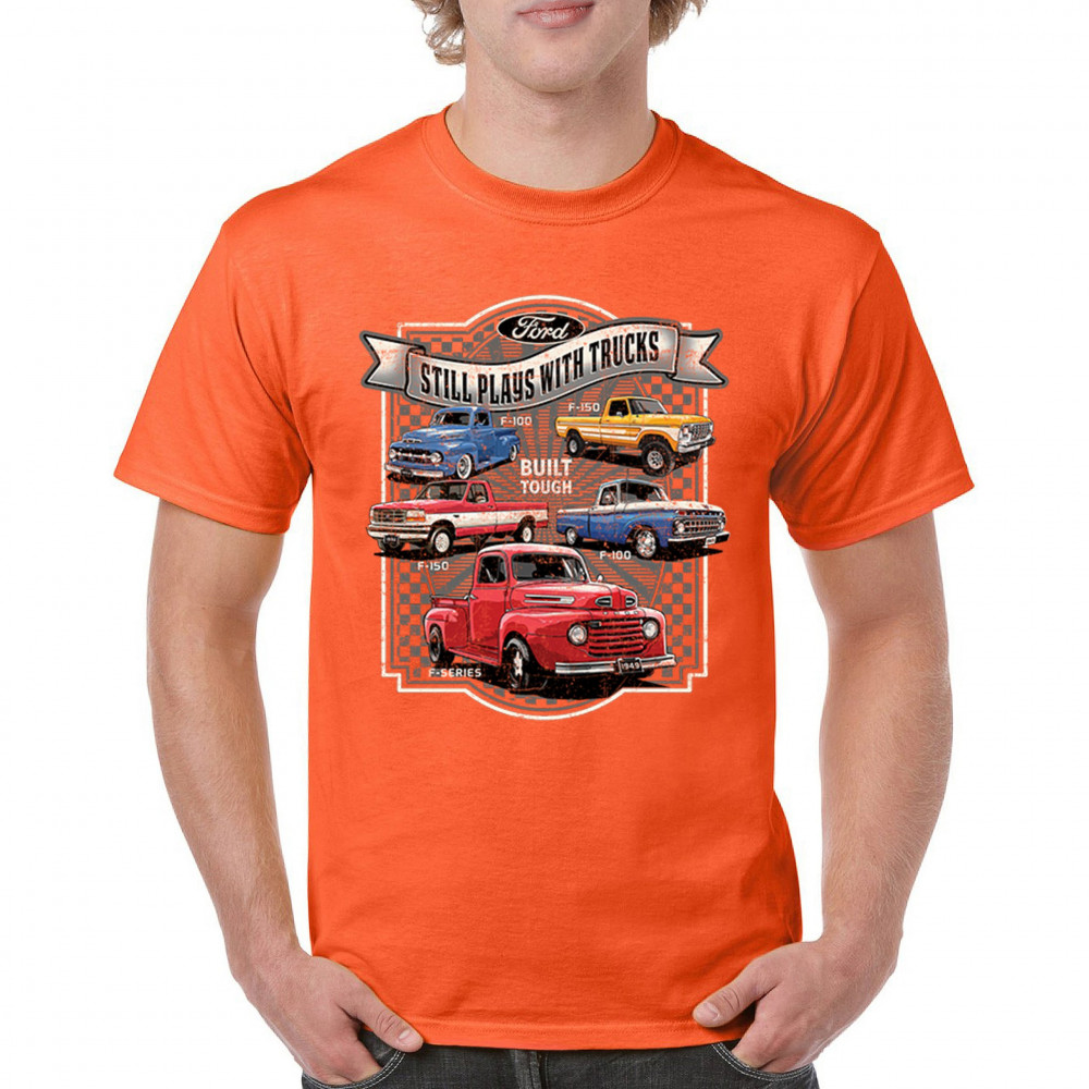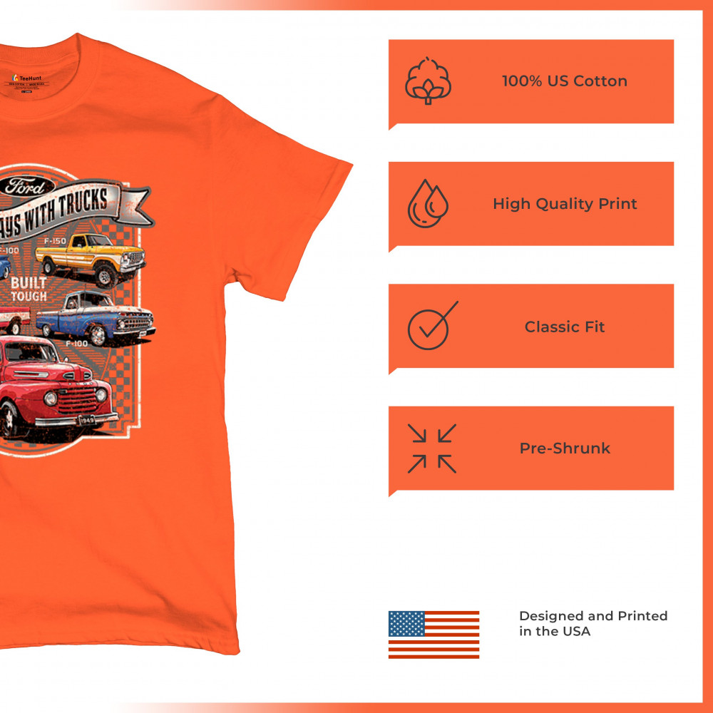 Features classic Ford F-Series trucks from 1949 to F-150. Great for vintage truck fans, garage wear, car shows, and collectors who love pickups.