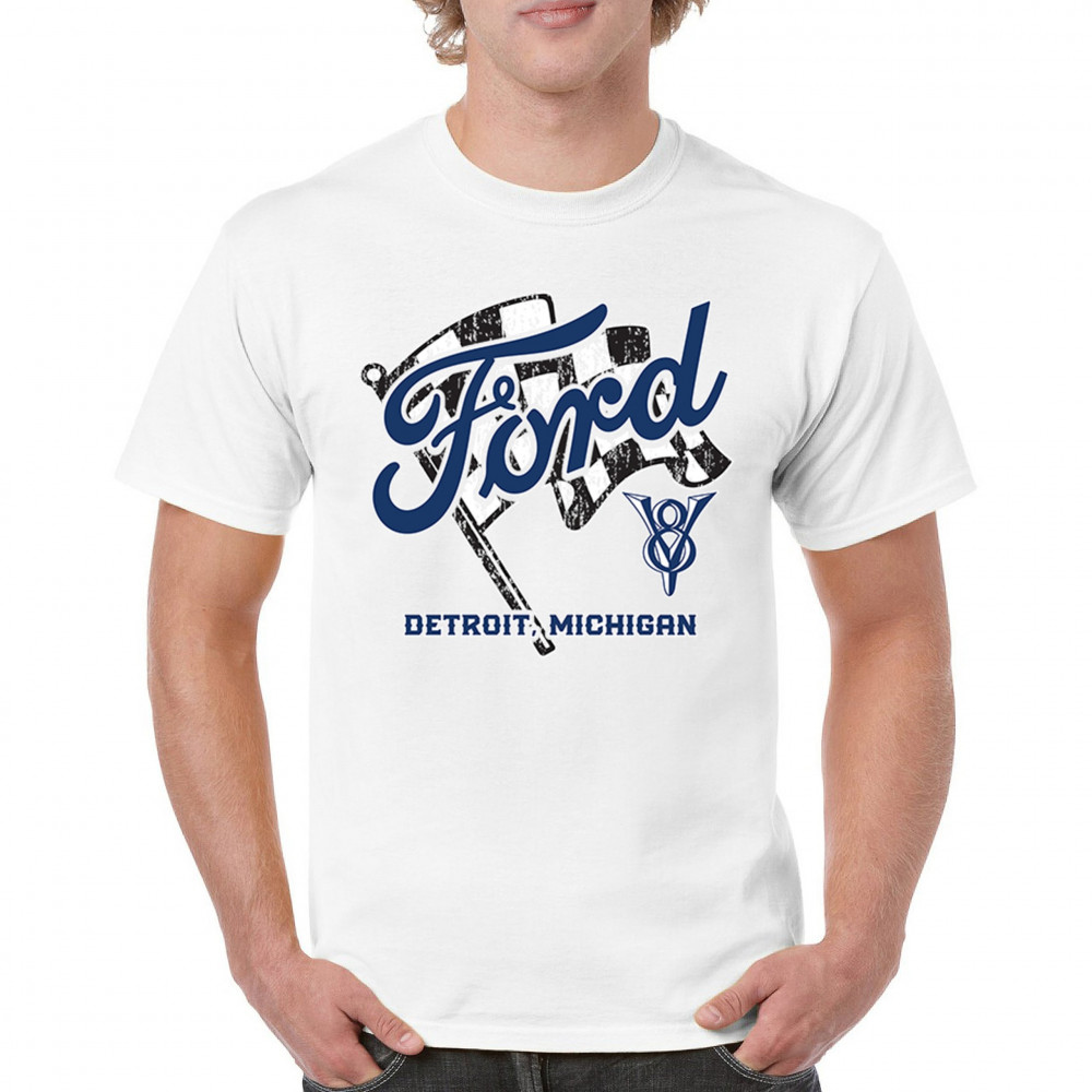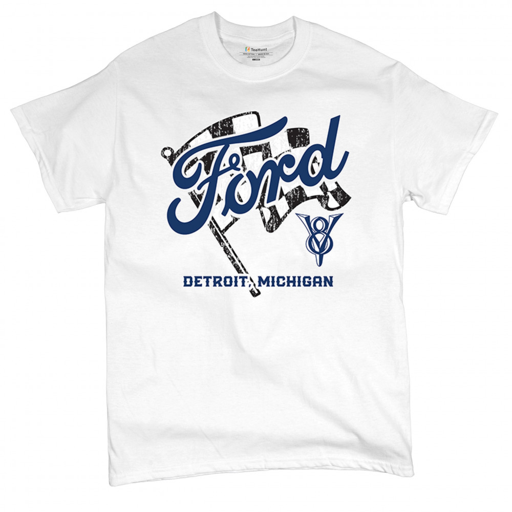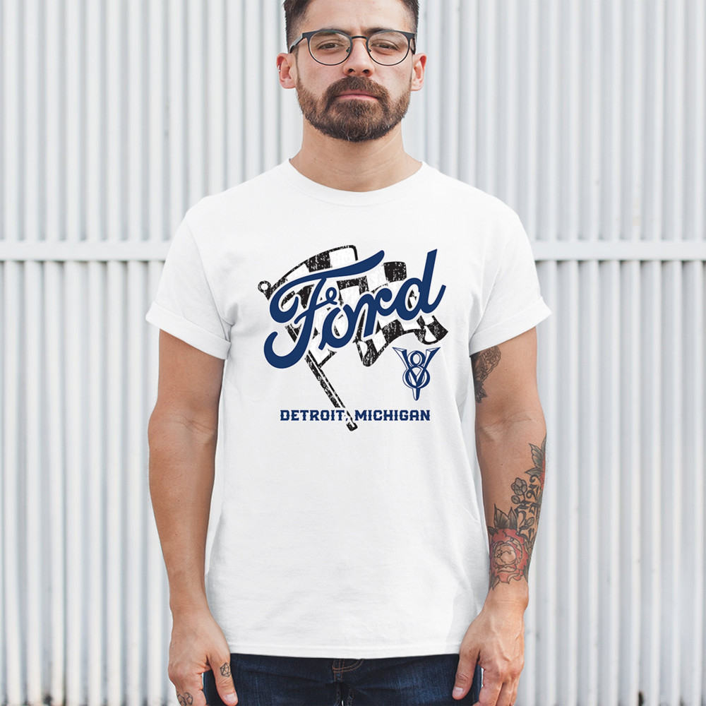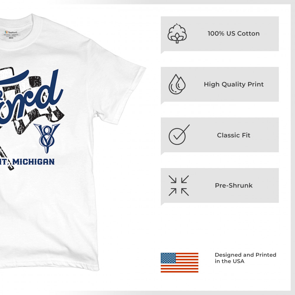 Honor Detroit, Michigan’s Ford legacy with this officially licensed design featuring a checkered flag and bold V8 emblem, perfect for muscle car fans and classic car lovers.