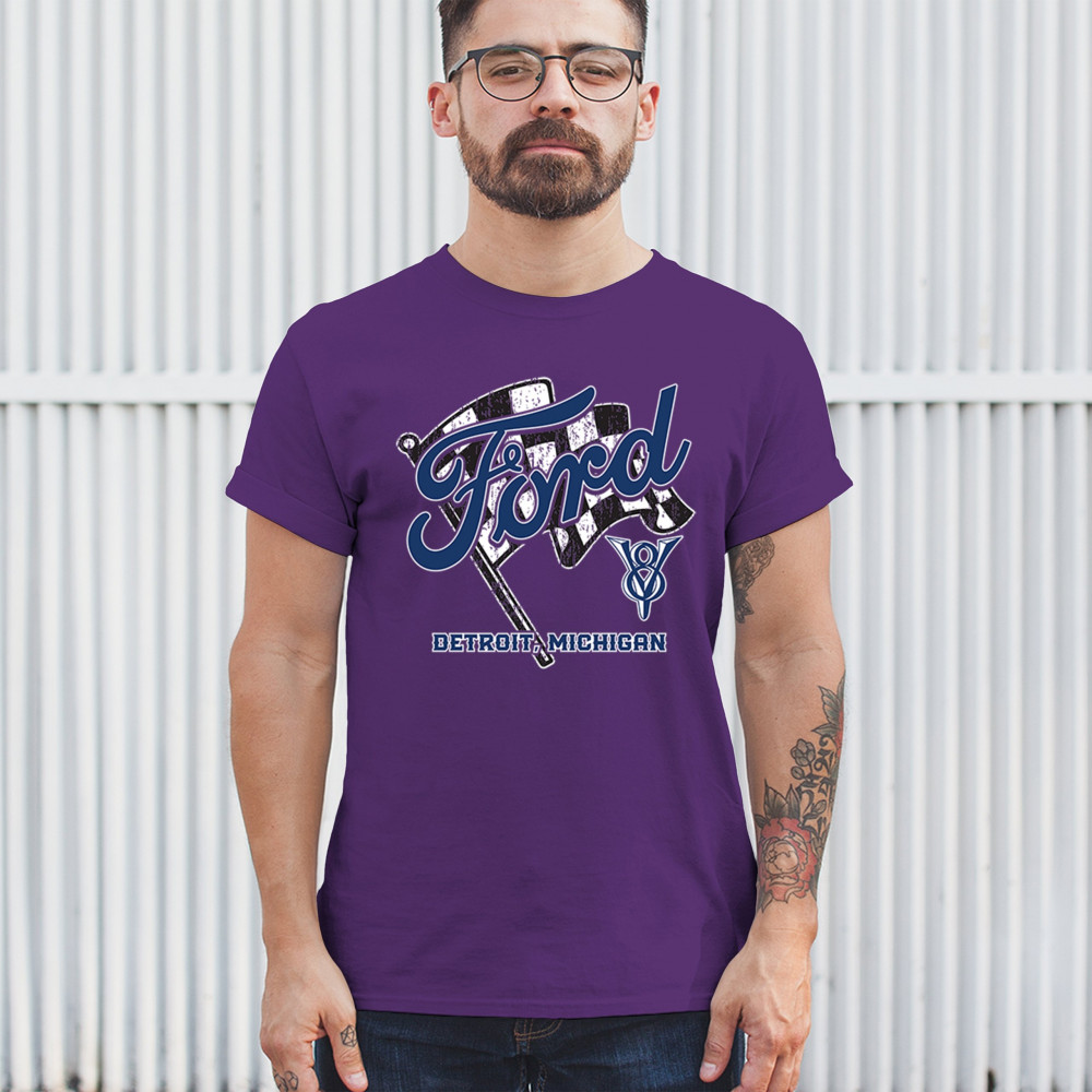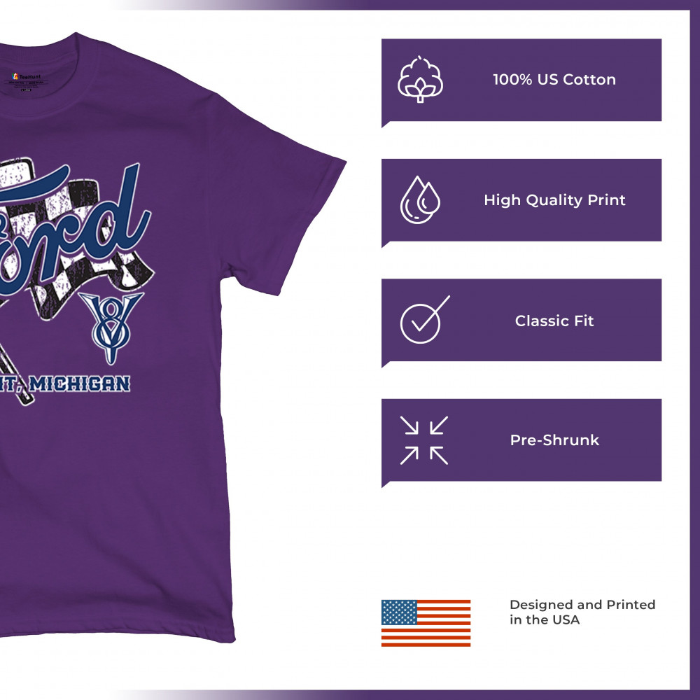Honor Detroit, Michigan’s Ford legacy with this officially licensed design featuring a checkered flag and bold V8 emblem, perfect for muscle car fans and classic car lovers.