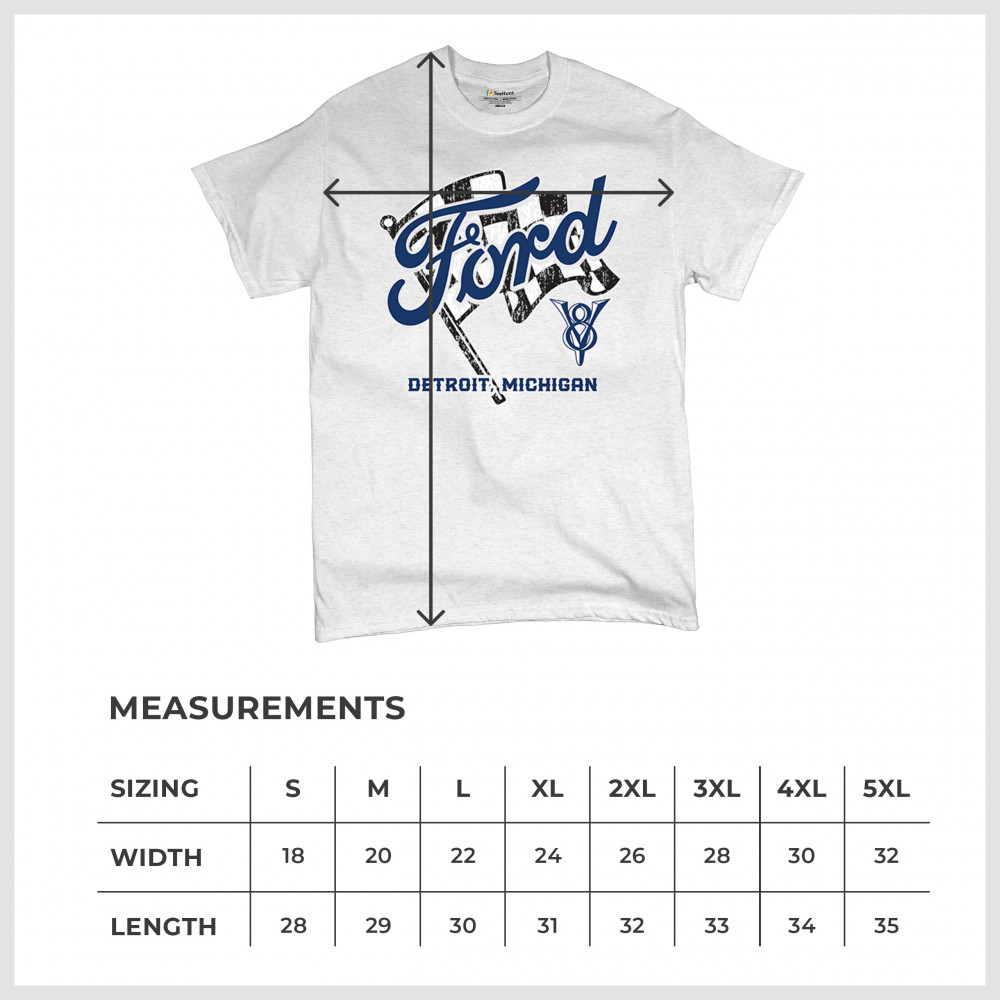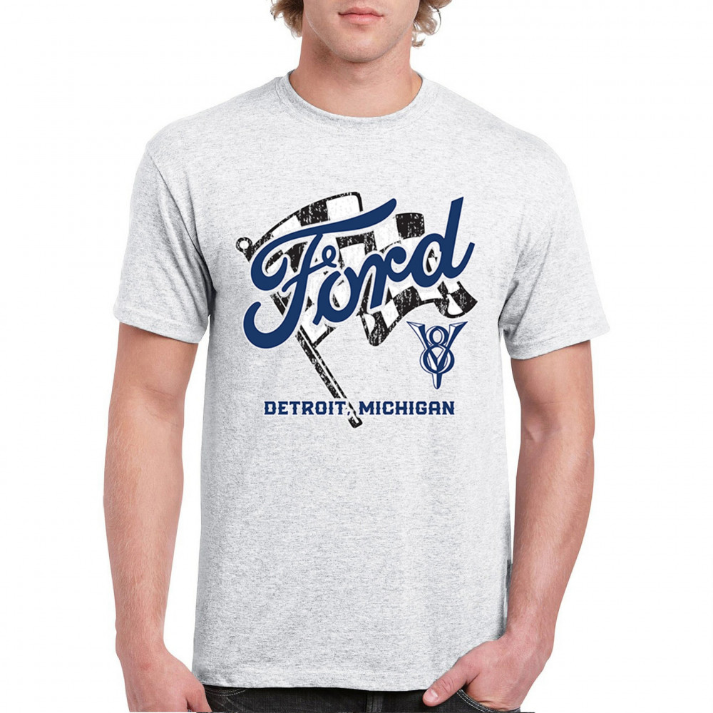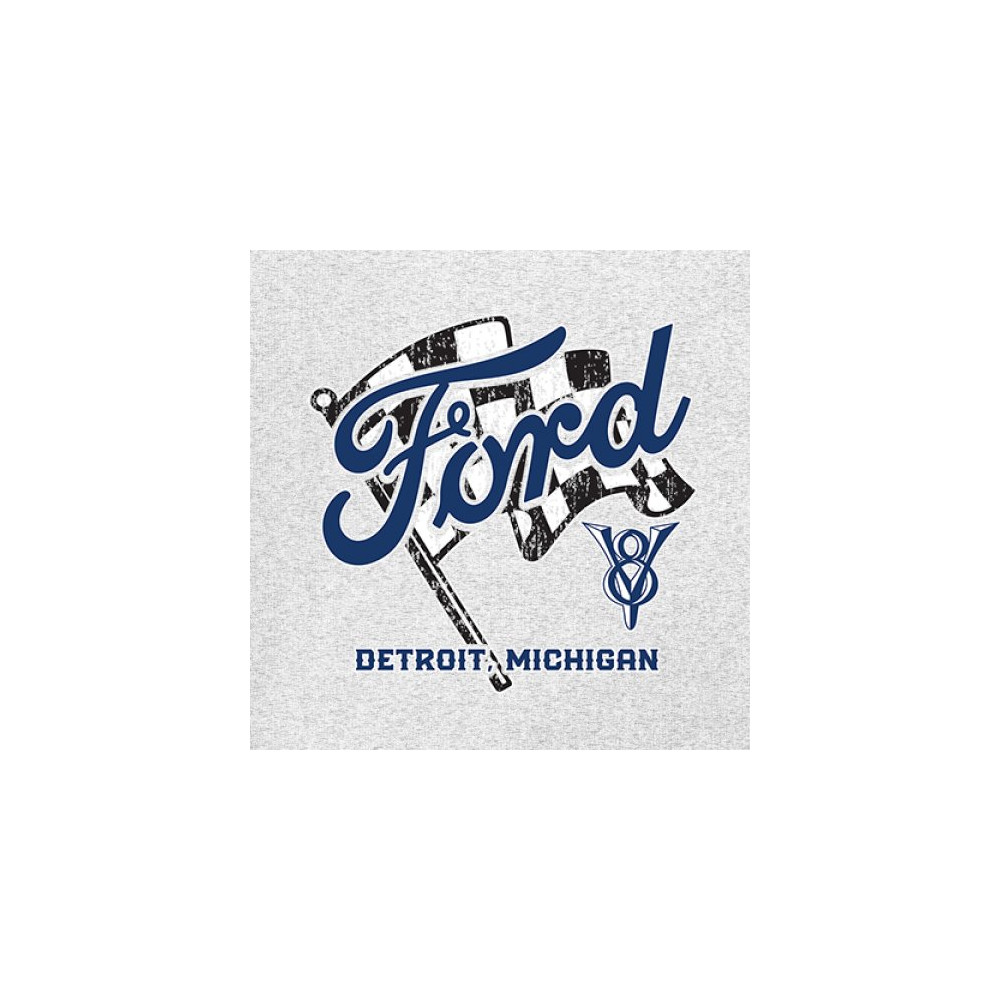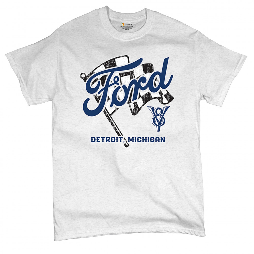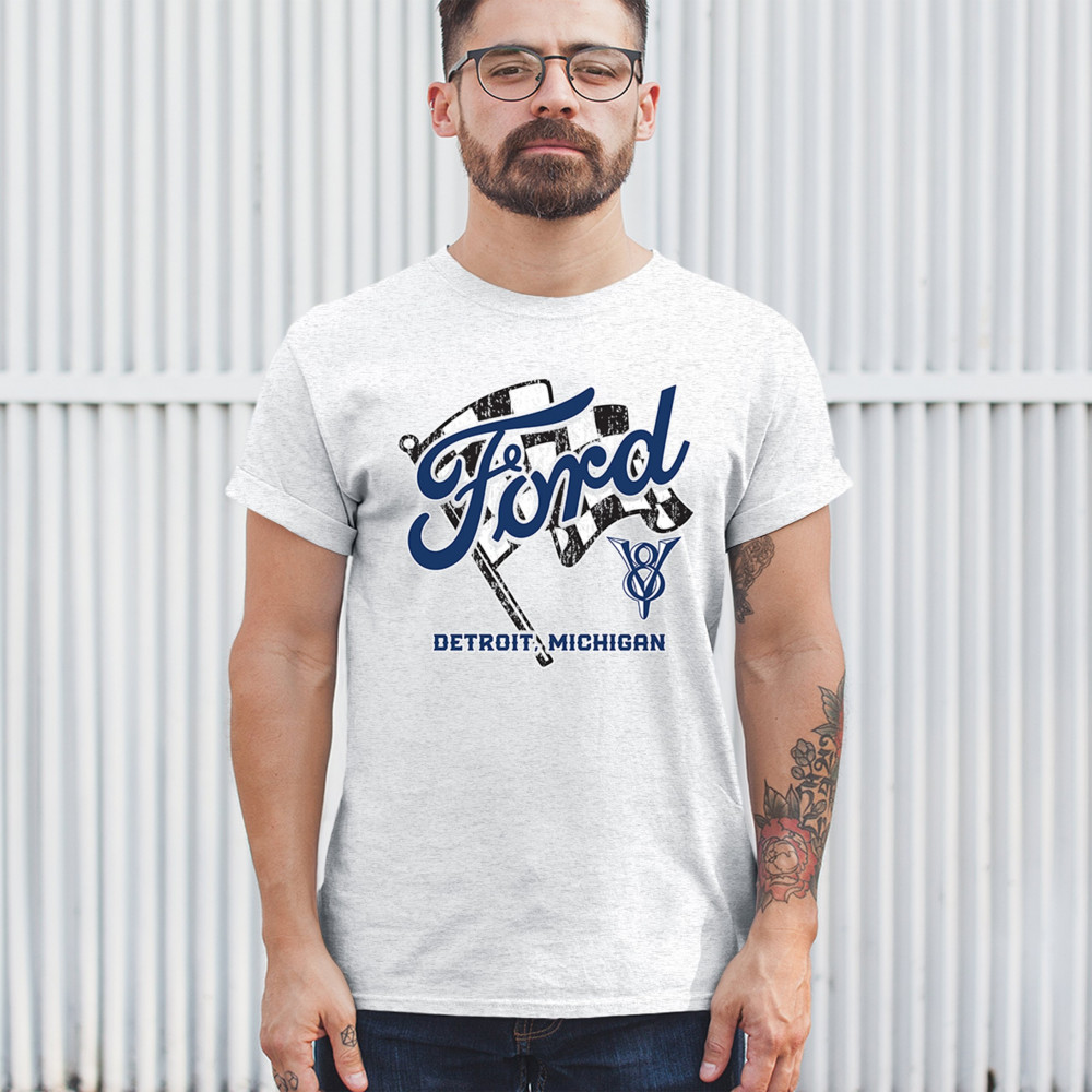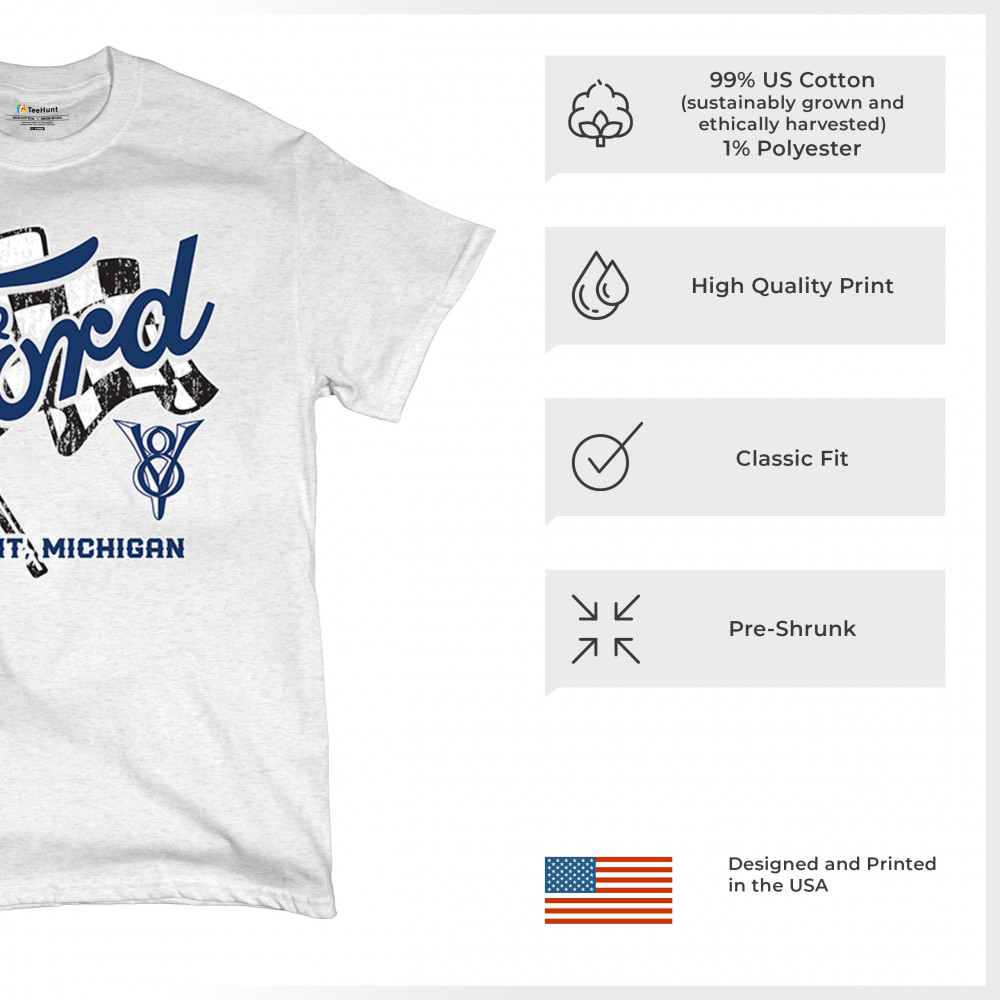 Honor Detroit, Michigan’s Ford legacy with this officially licensed design featuring a checkered flag and bold V8 emblem, perfect for muscle car fans and classic car lovers.