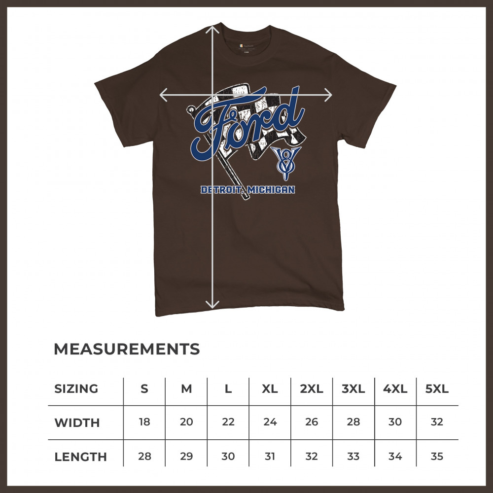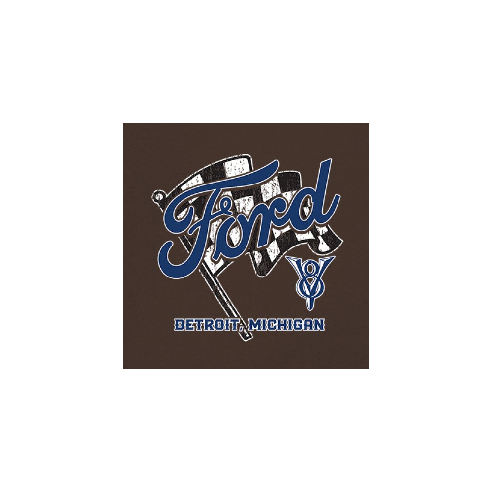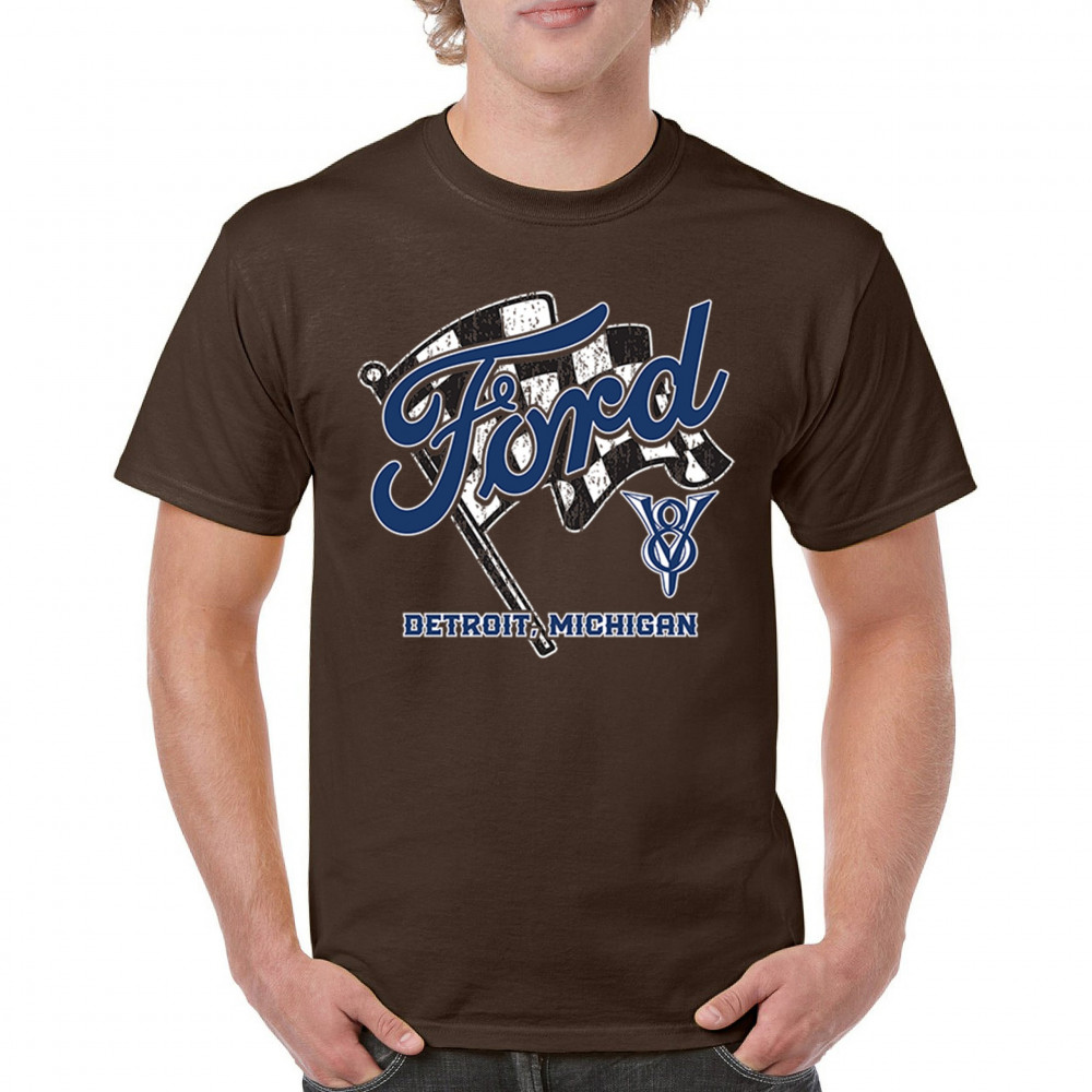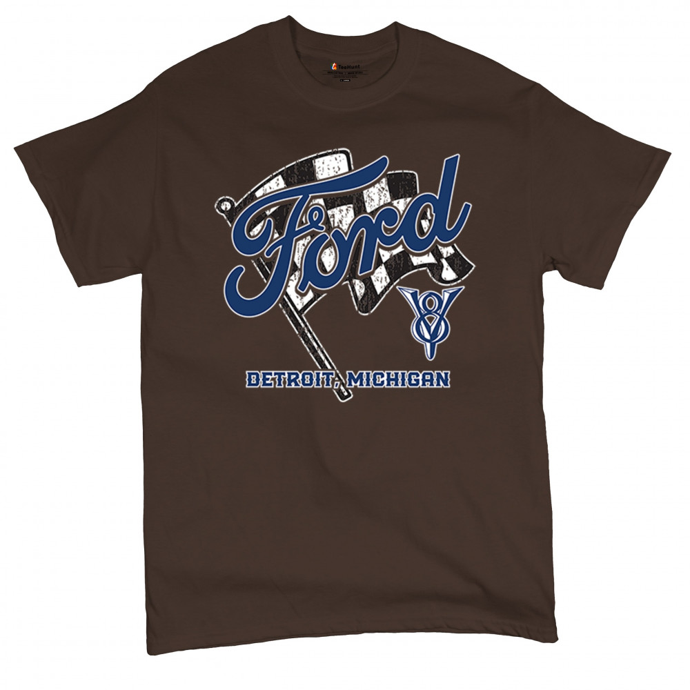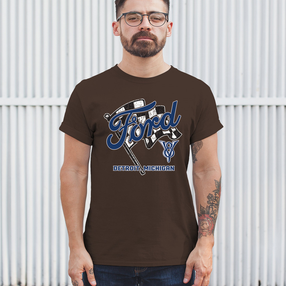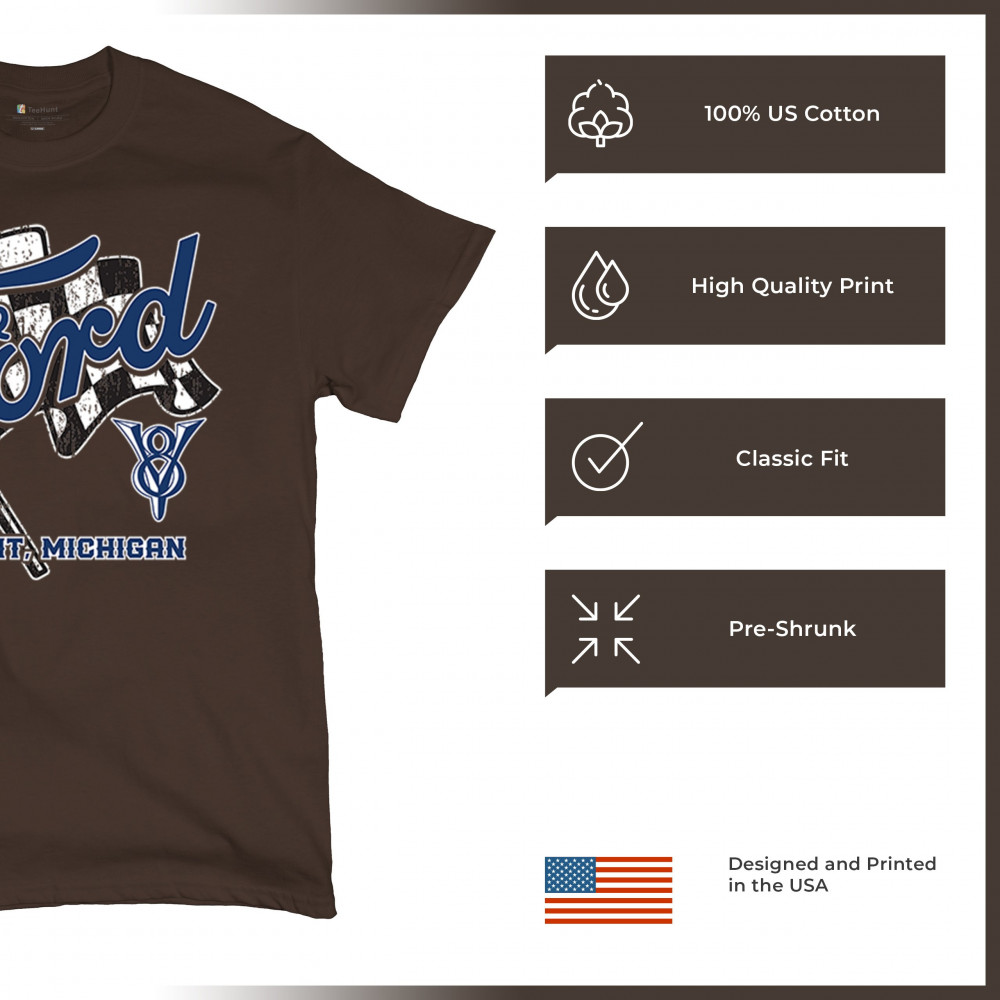 Honor Detroit, Michigan’s Ford legacy with this officially licensed design featuring a checkered flag and bold V8 emblem, perfect for muscle car fans and classic car lovers.