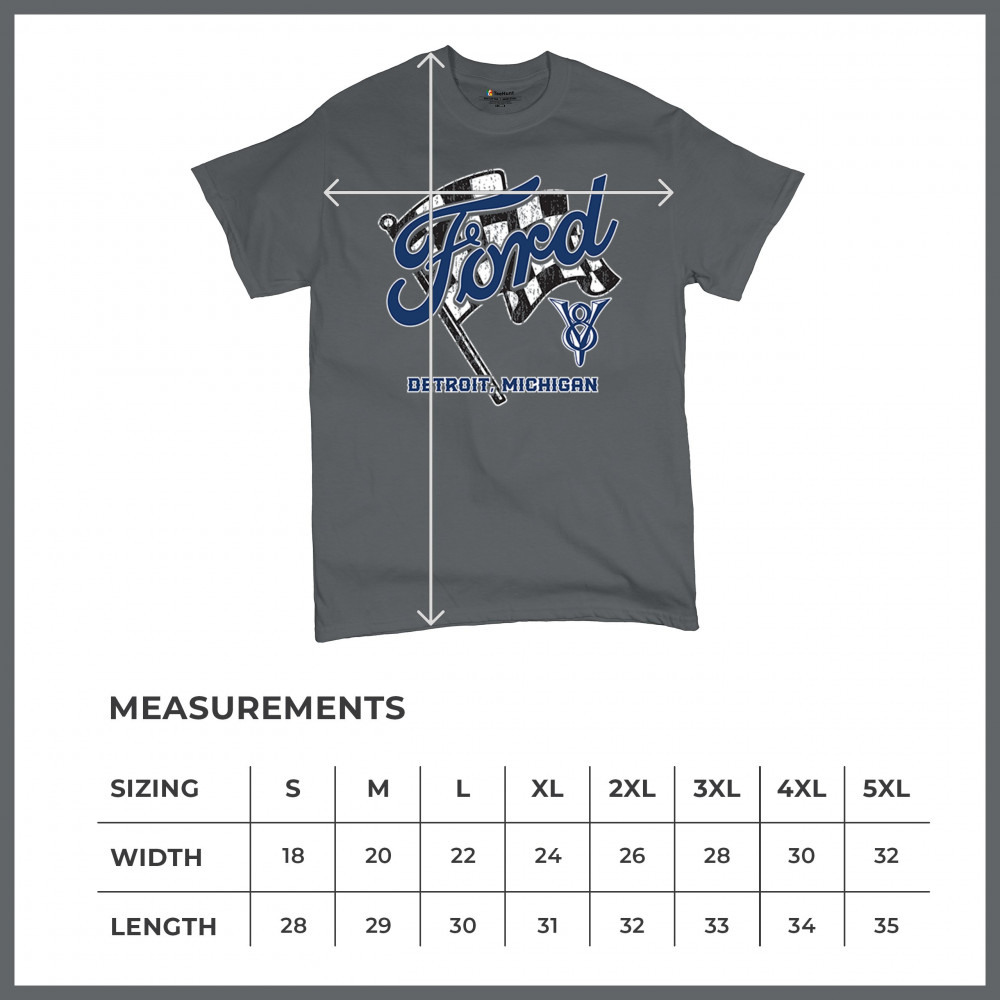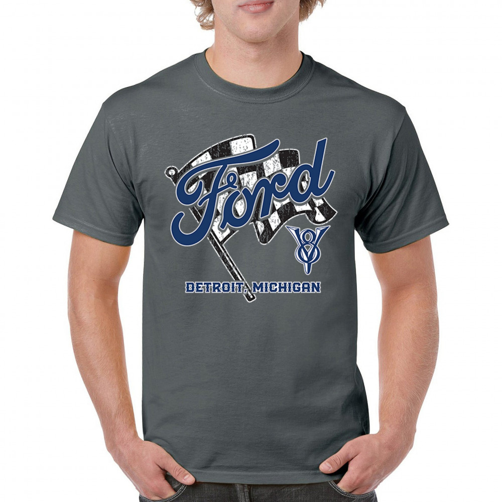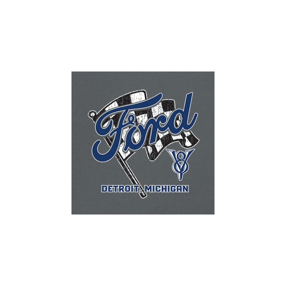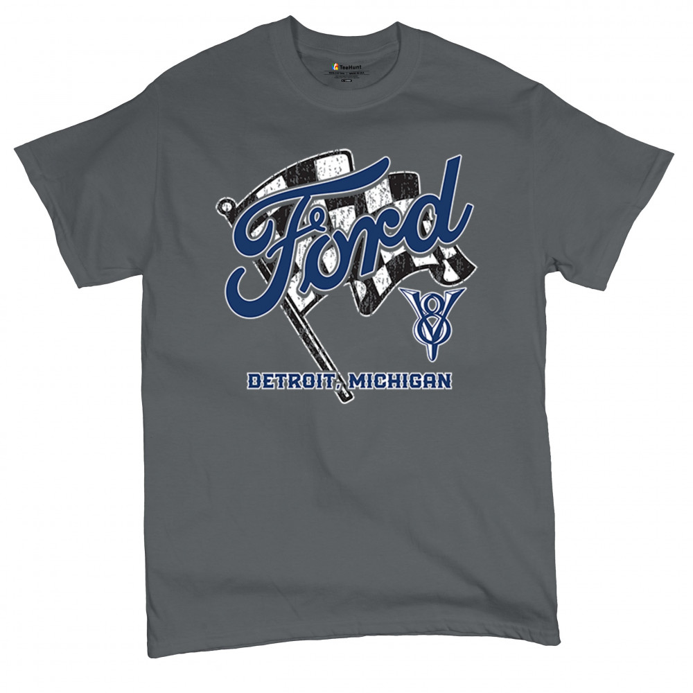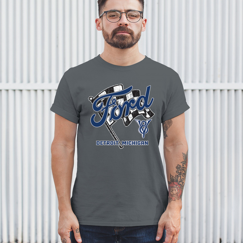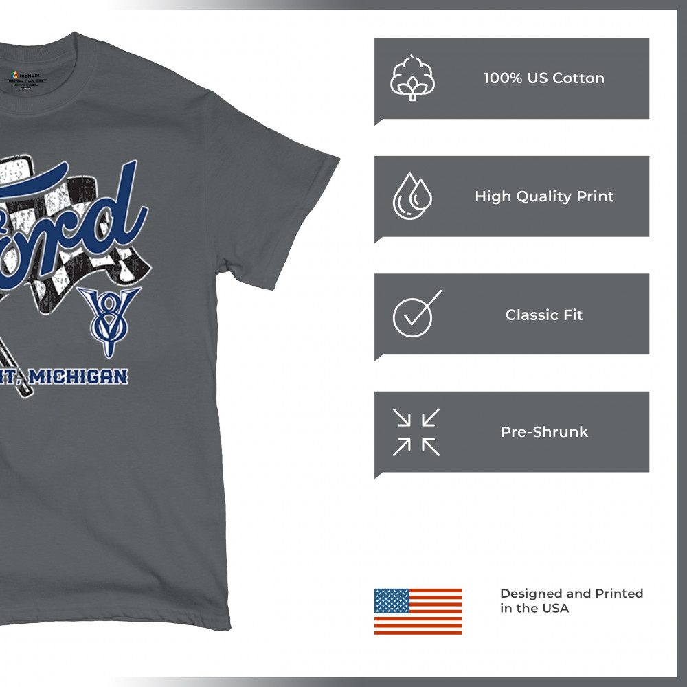 Honor Detroit, Michigan’s Ford legacy with this officially licensed design featuring a checkered flag and bold V8 emblem, perfect for muscle car fans and classic car lovers.