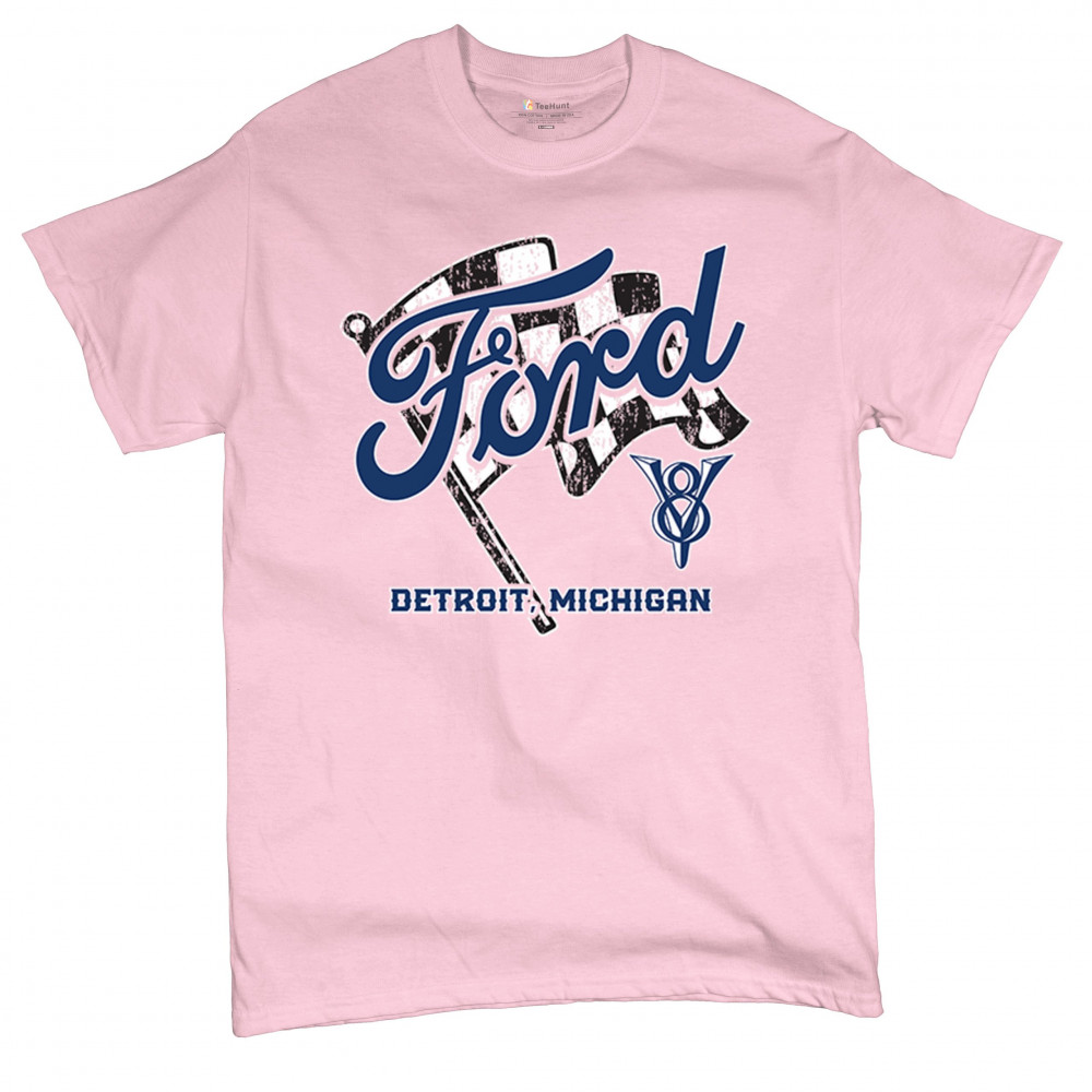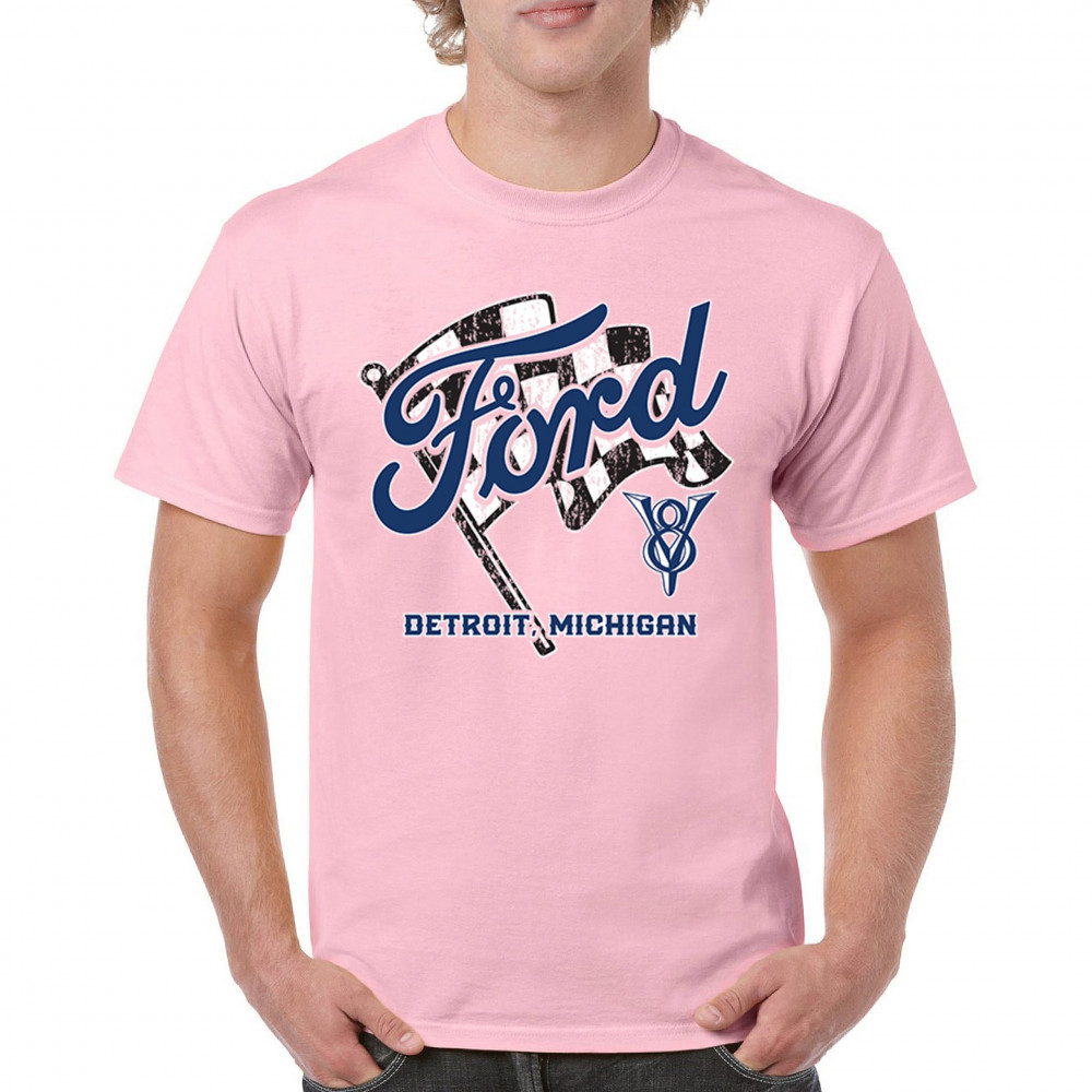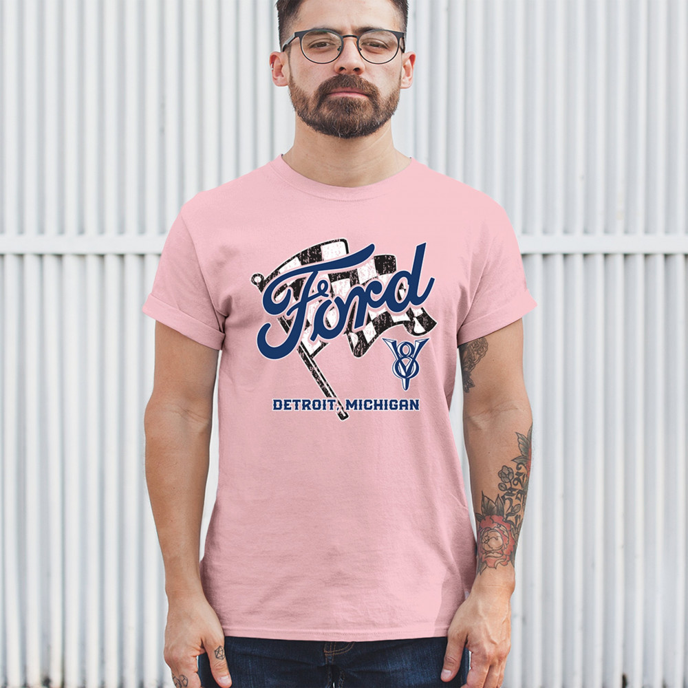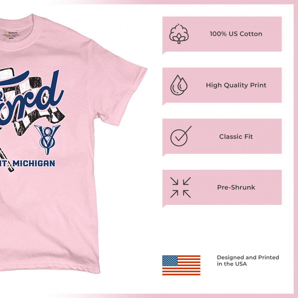 Honor Detroit, Michigan’s Ford legacy with this officially licensed design featuring a checkered flag and bold V8 emblem, perfect for muscle car fans and classic car lovers.