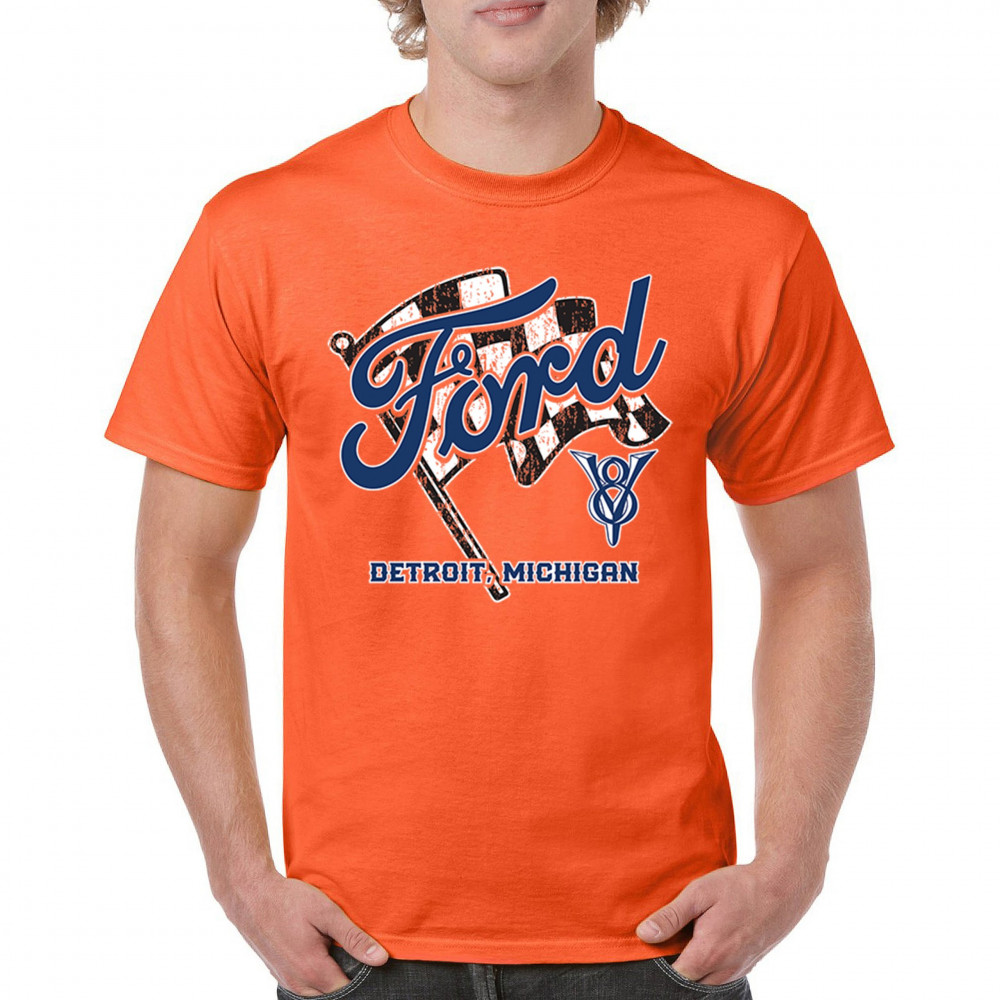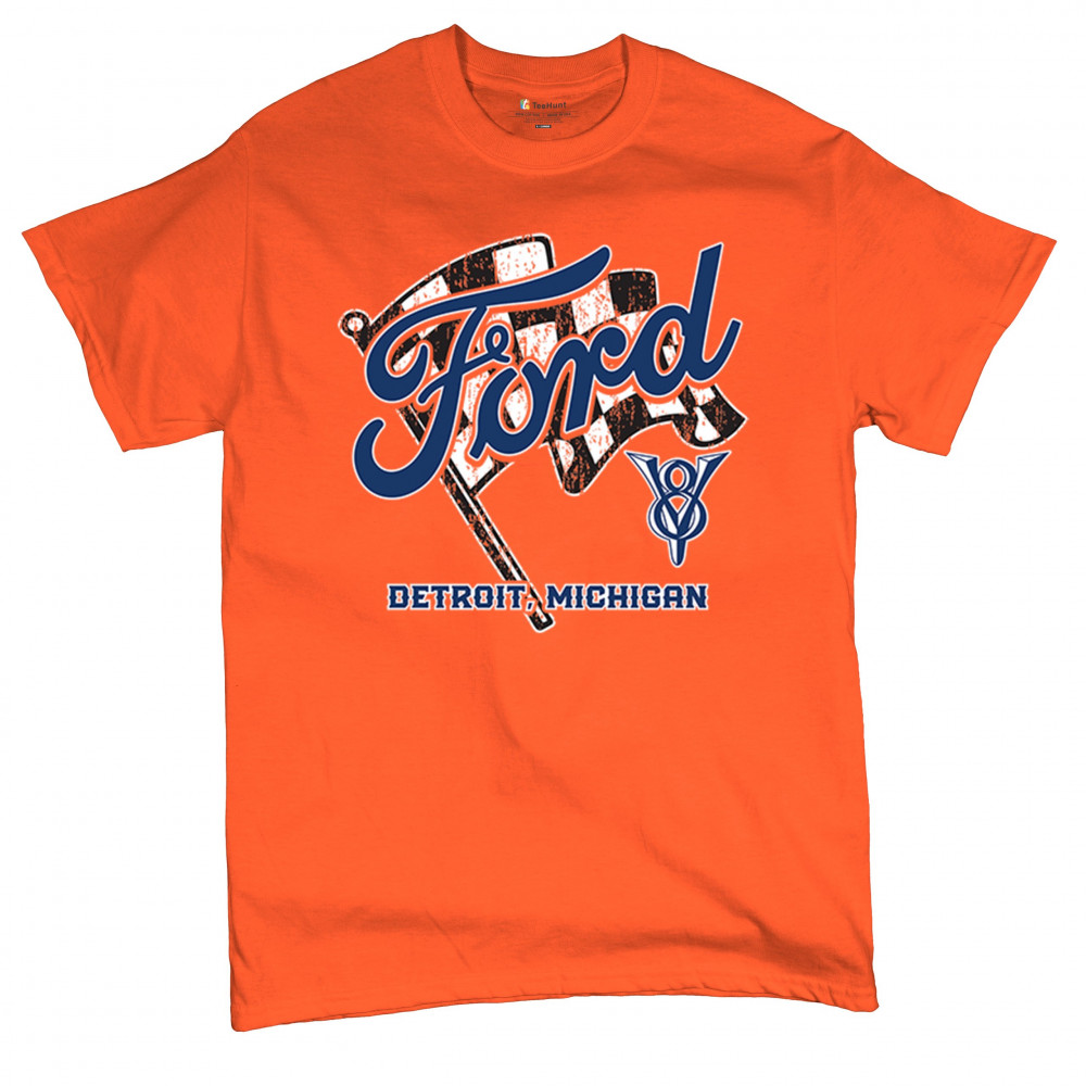 Honor Detroit, Michigan’s Ford legacy with this officially licensed design featuring a checkered flag and bold V8 emblem, perfect for muscle car fans and classic car lovers.