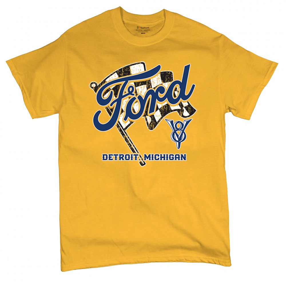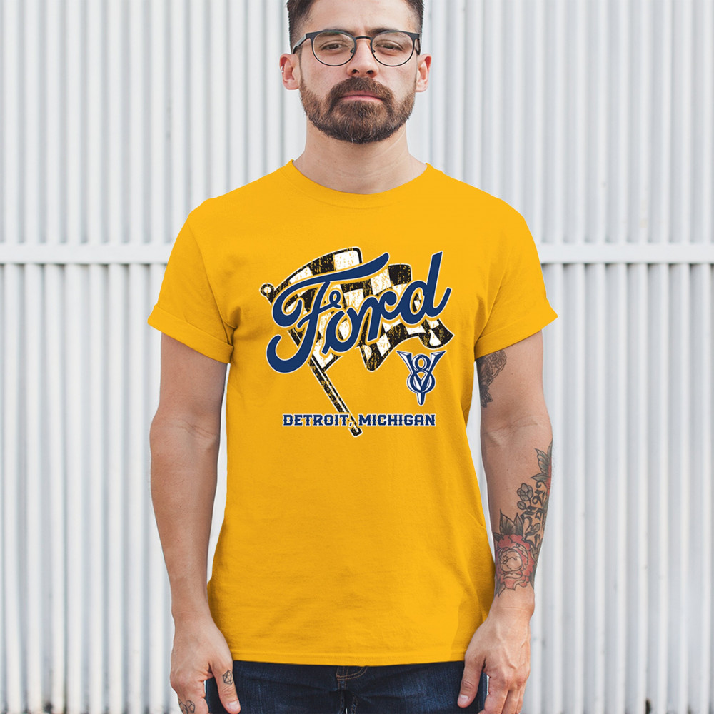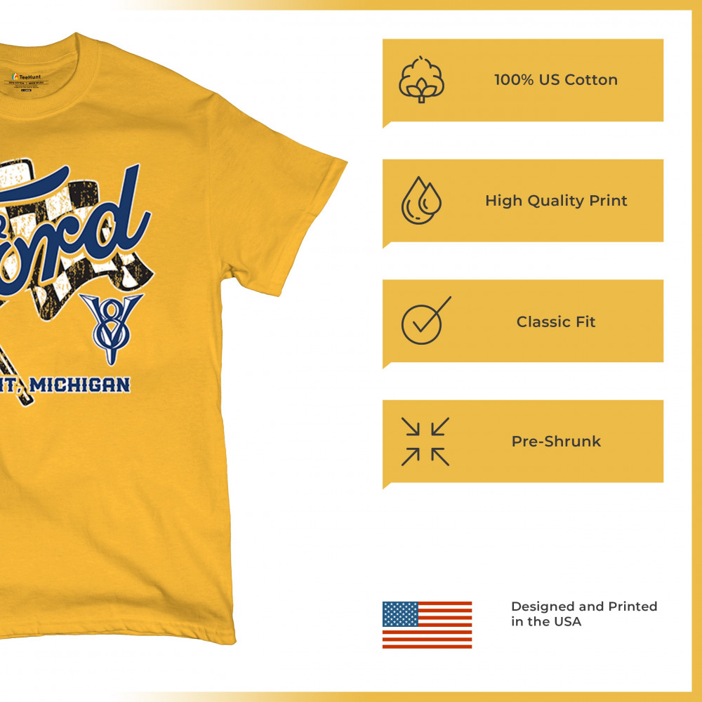 Honor Detroit, Michigan’s Ford legacy with this officially licensed design featuring a checkered flag and bold V8 emblem, perfect for muscle car fans and classic car lovers.
