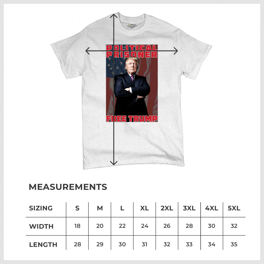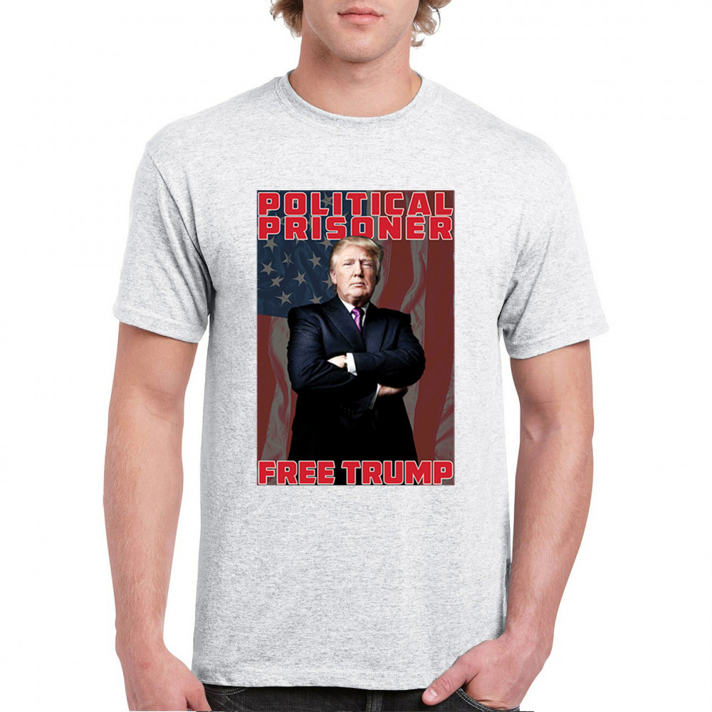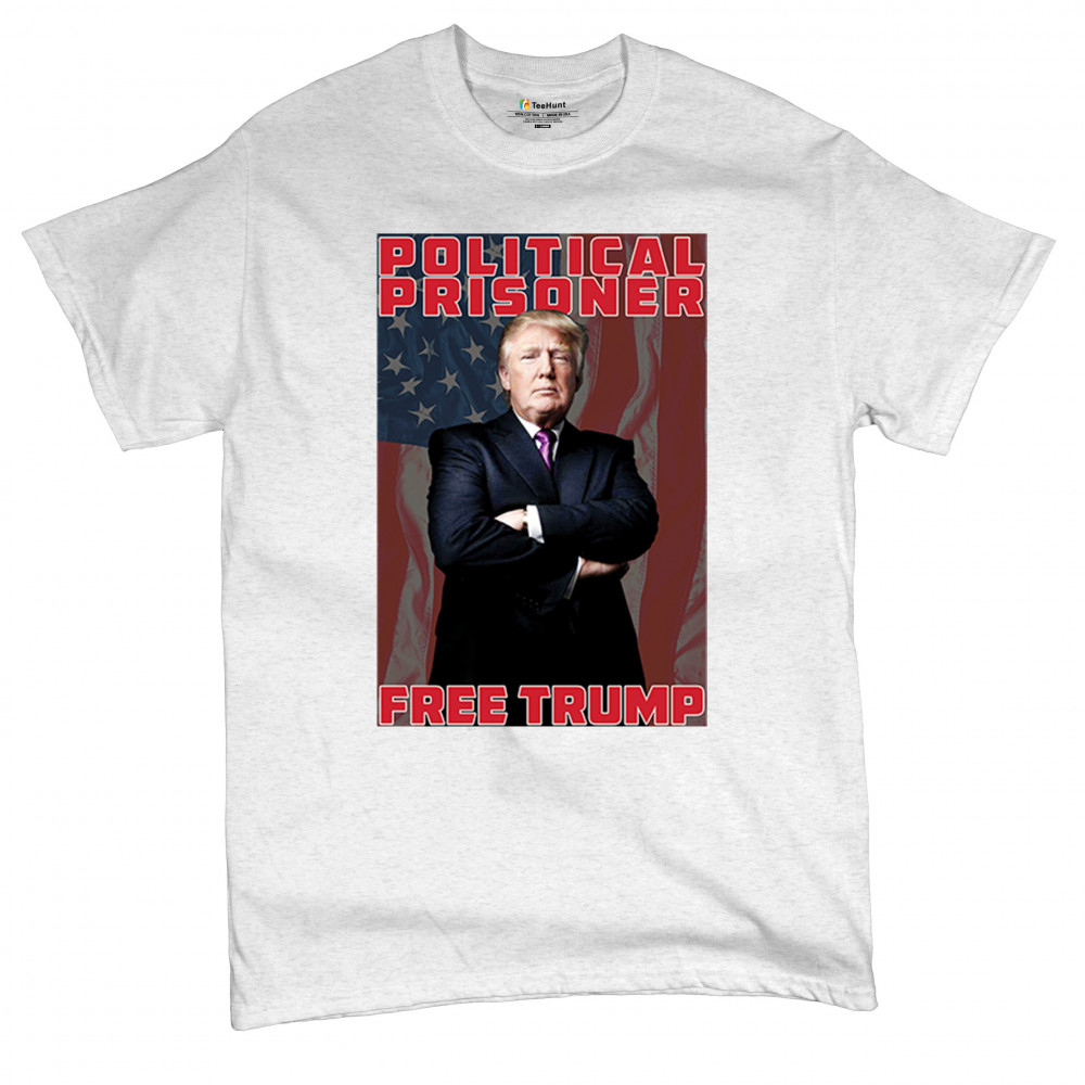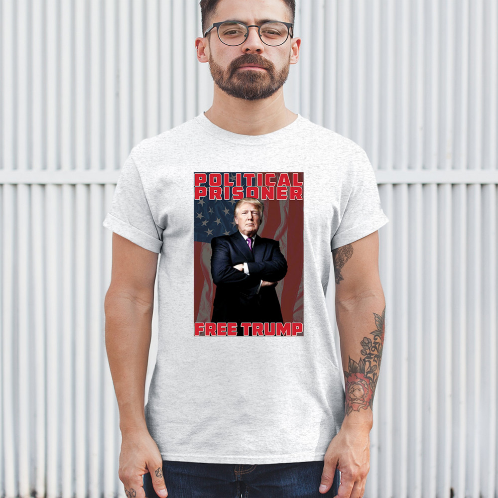 Show your support with the "Political Prisoner Free Trump" design, featuring Trump against an American flag. Perfect for conservative patriots and Trump supporters.