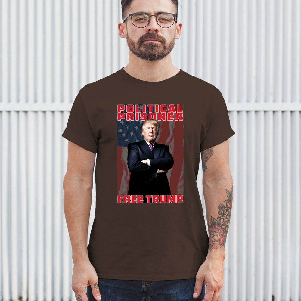 Show your support with the "Political Prisoner Free Trump" design, featuring Trump against an American flag. Perfect for conservative patriots and Trump supporters.