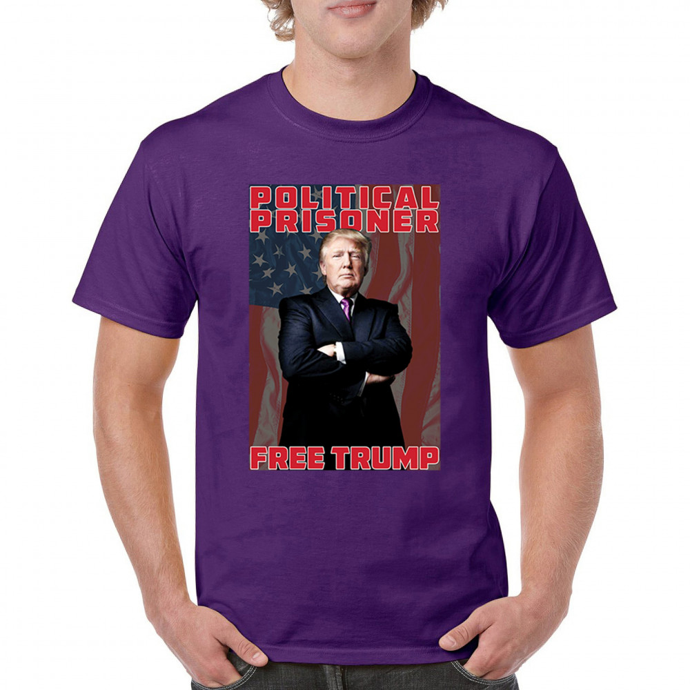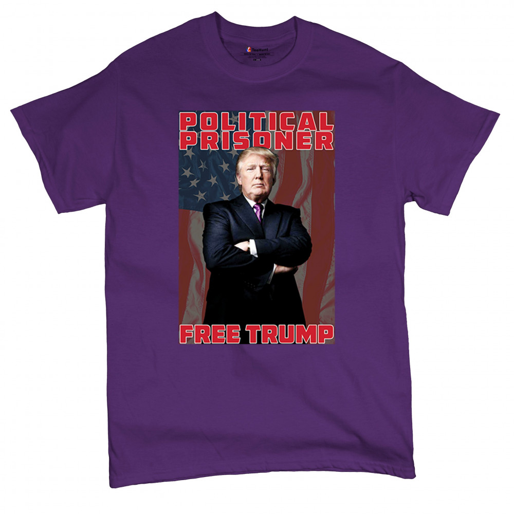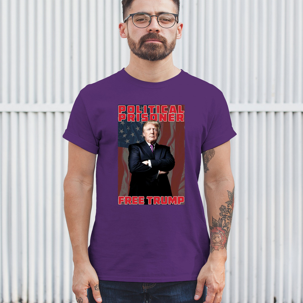 Show your support with the "Political Prisoner Free Trump" design, featuring Trump against an American flag. Perfect for conservative patriots and Trump supporters.