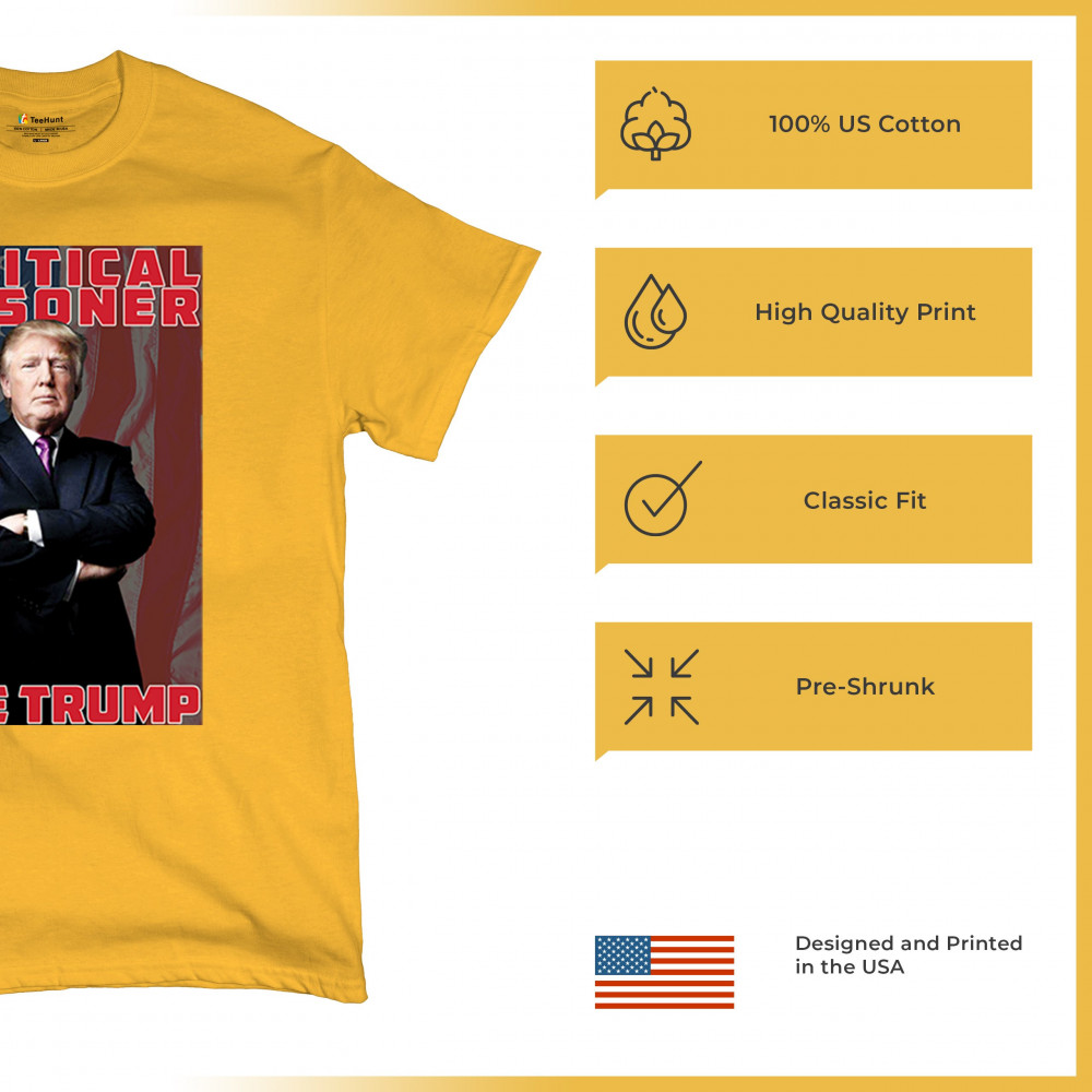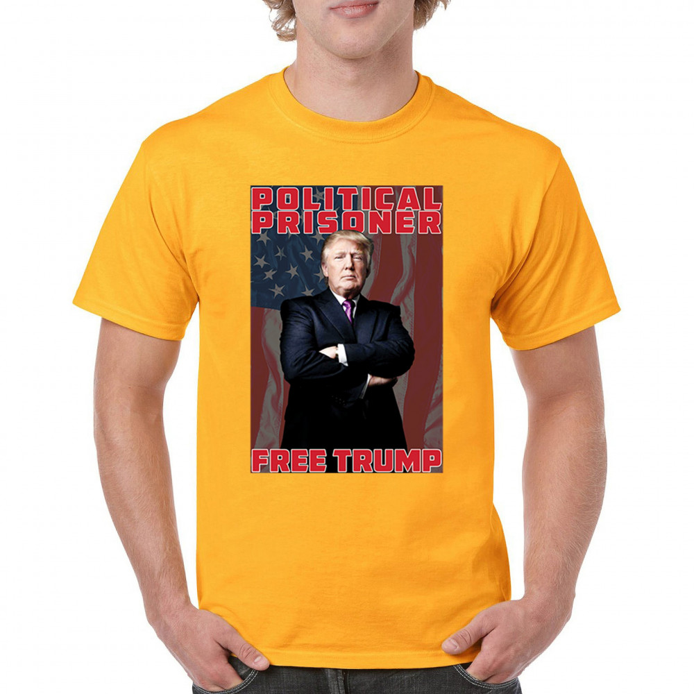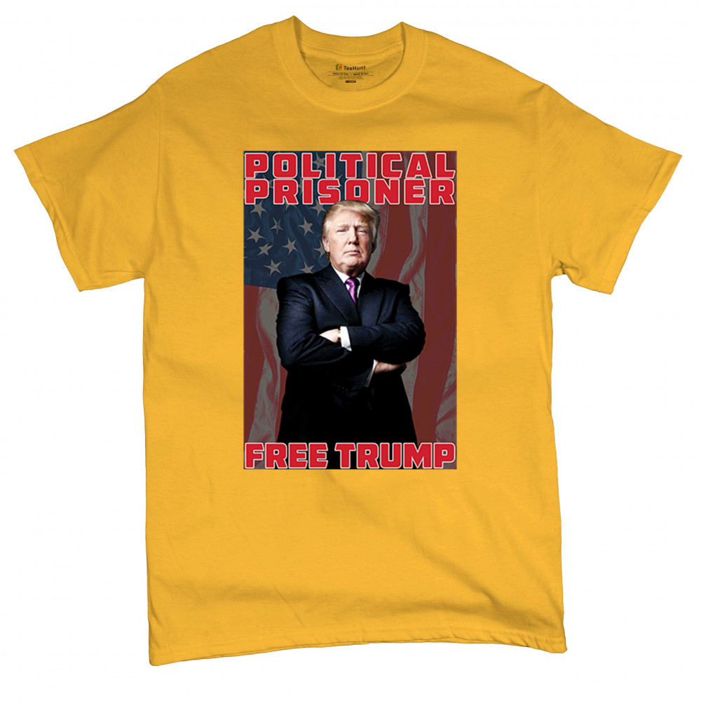 Show your support with the "Political Prisoner Free Trump" design, featuring Trump against an American flag. Perfect for conservative patriots and Trump supporters.