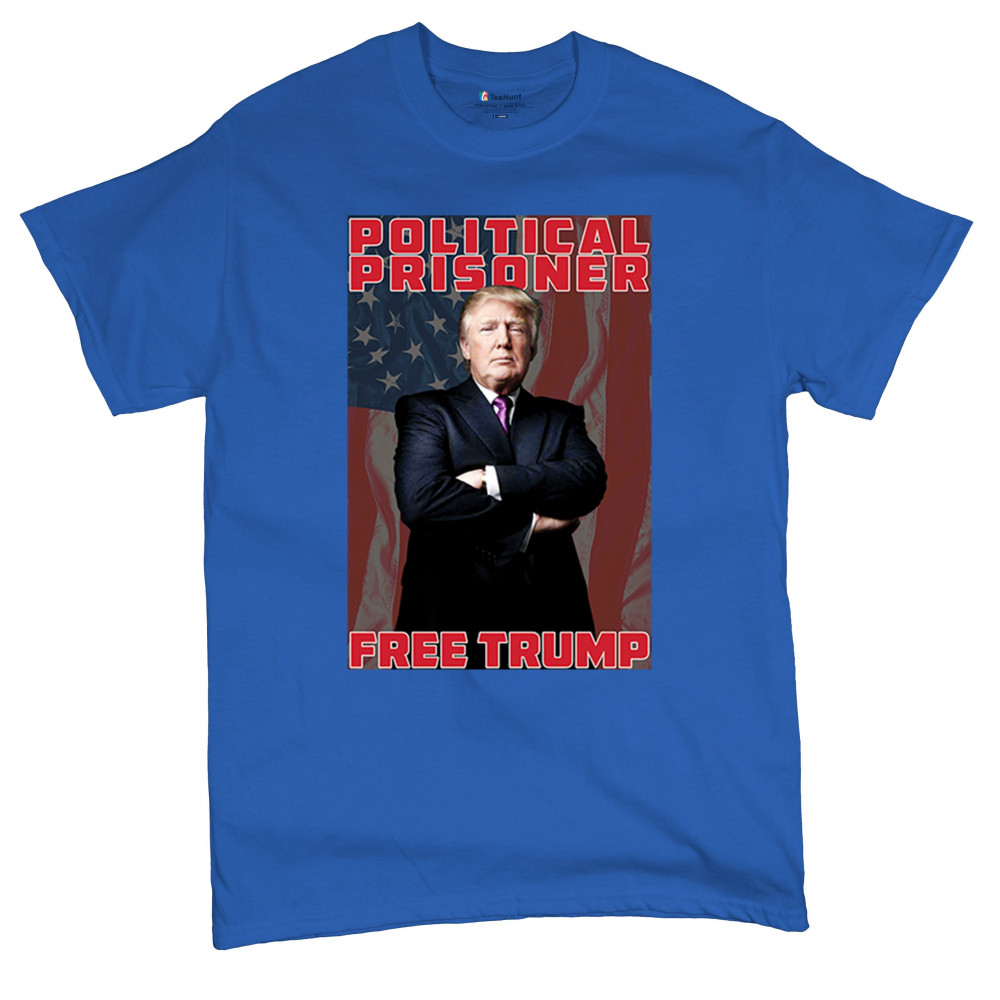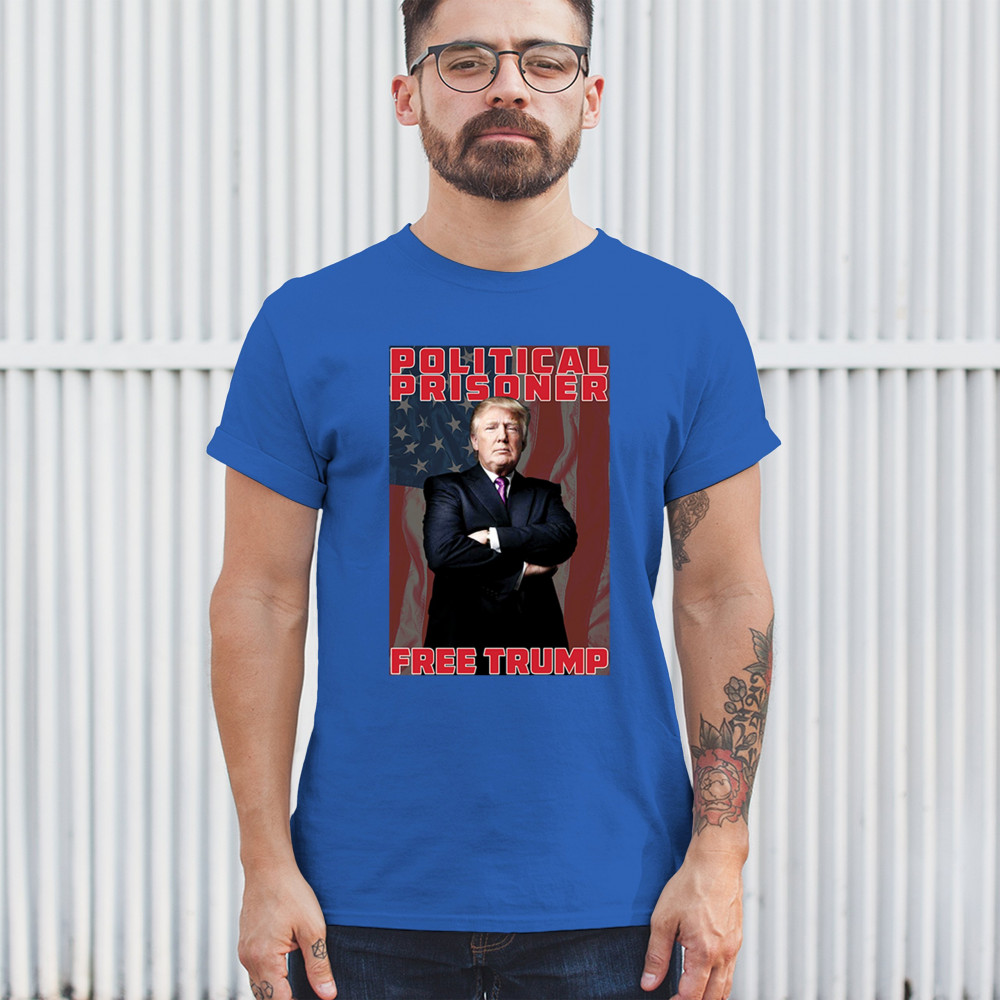 Show your support with the "Political Prisoner Free Trump" design, featuring Trump against an American flag. Perfect for conservative patriots and Trump supporters.