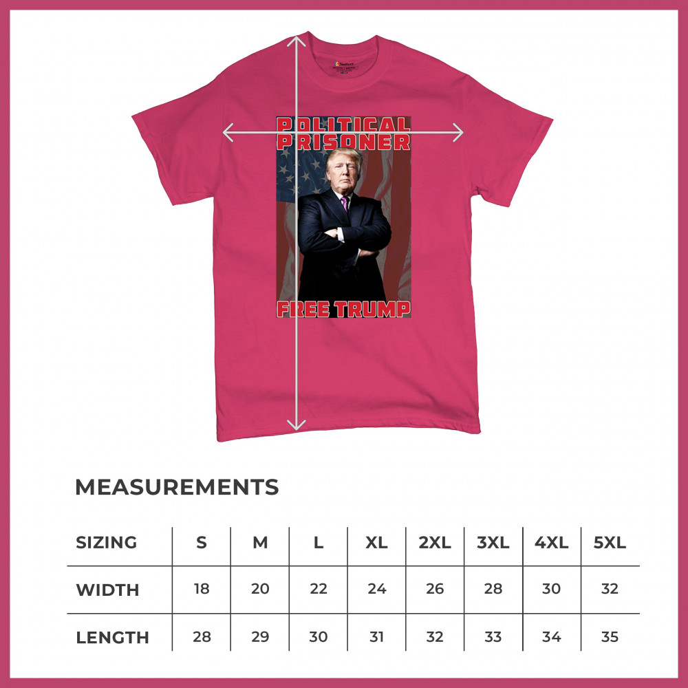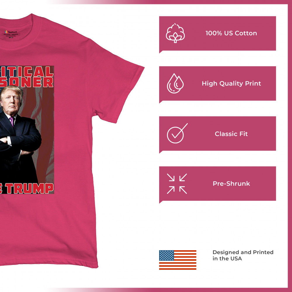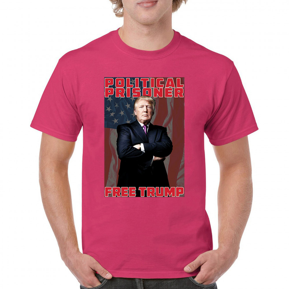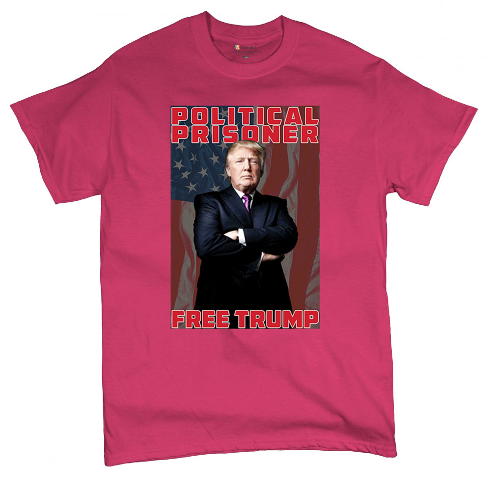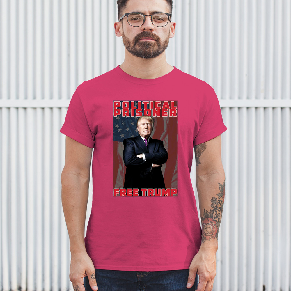 Show your support with the "Political Prisoner Free Trump" design, featuring Trump against an American flag. Perfect for conservative patriots and Trump supporters.