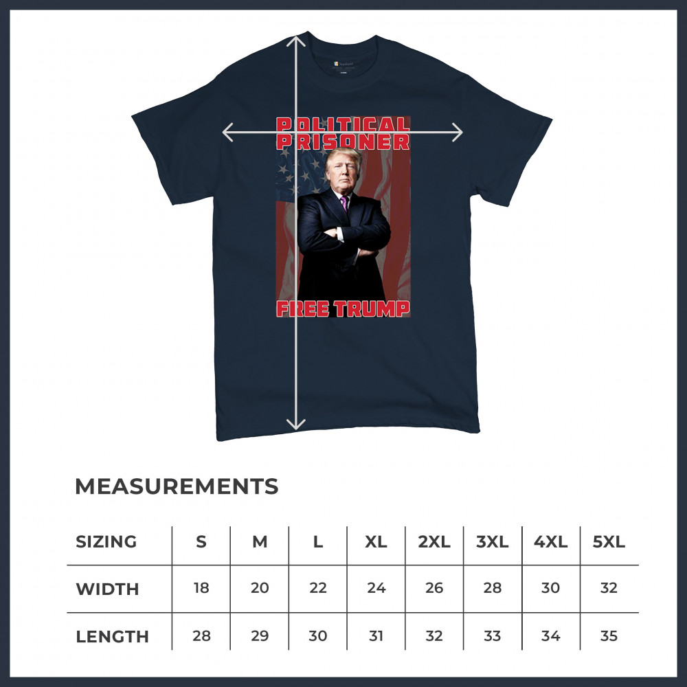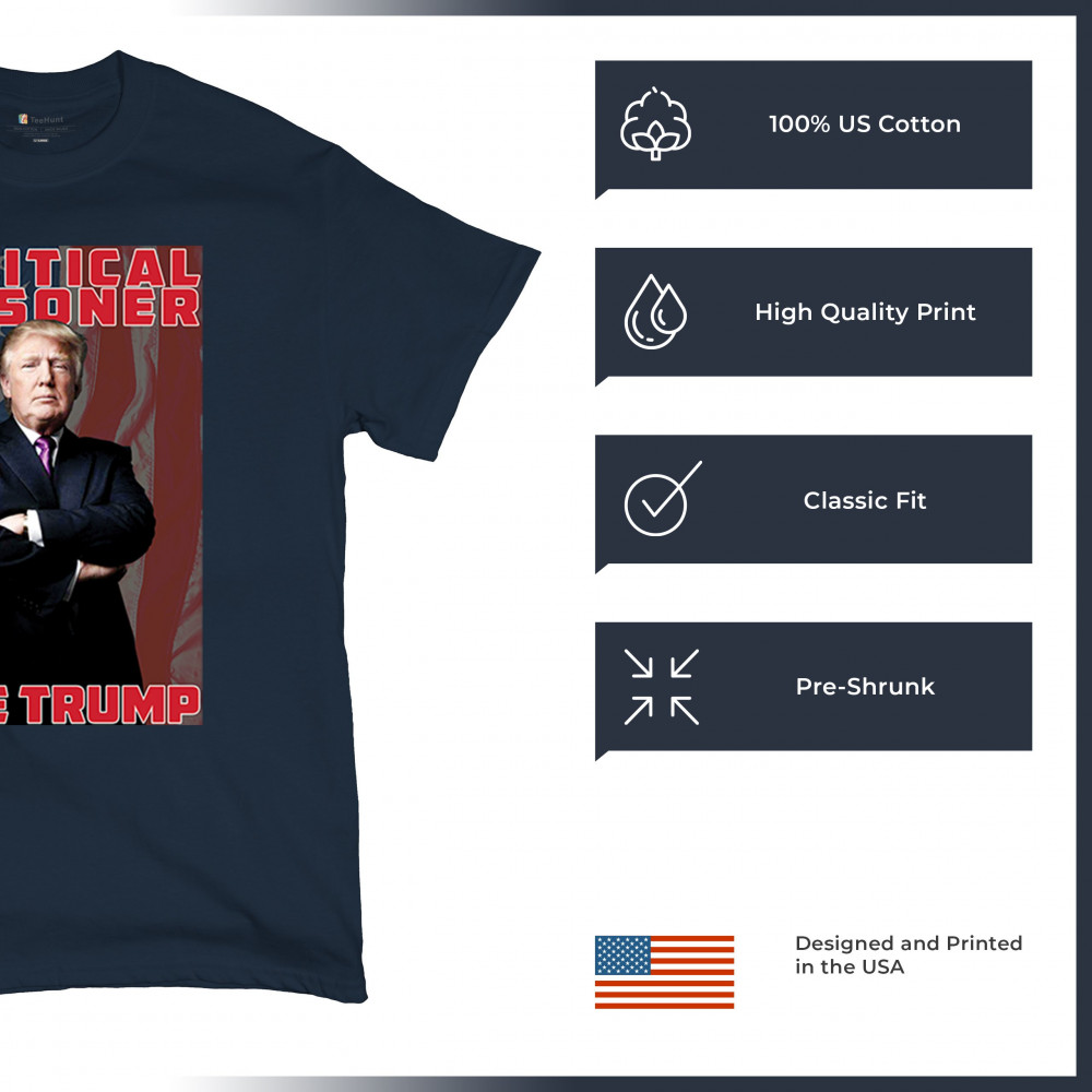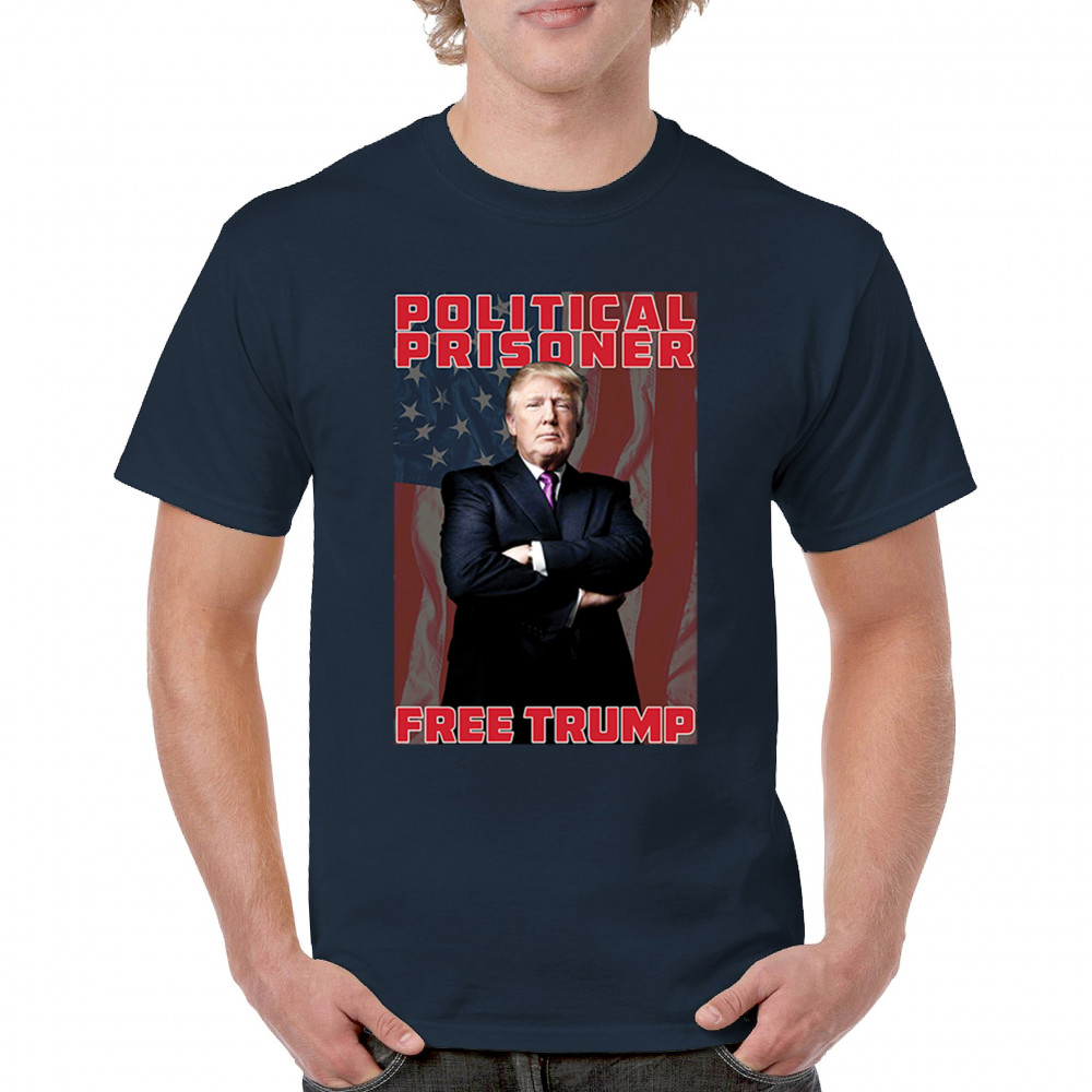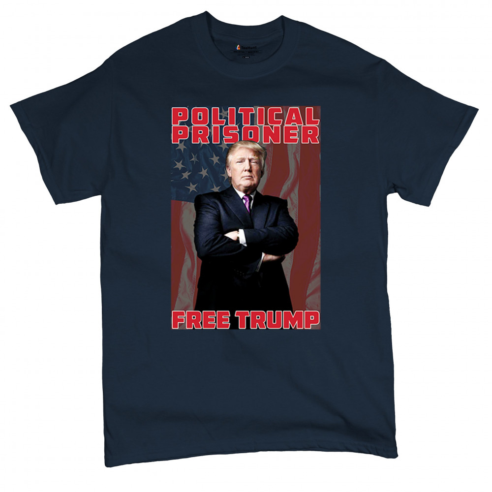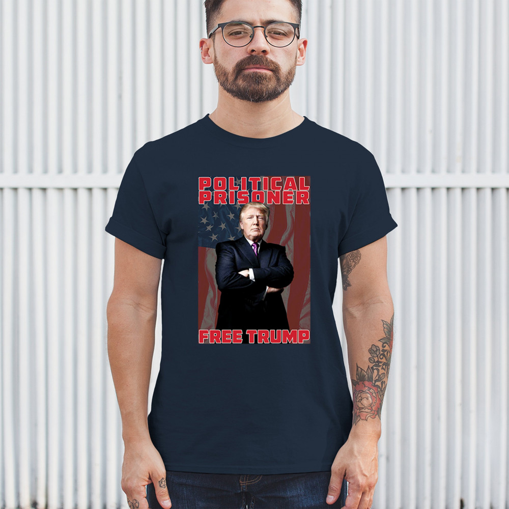Show your support with the "Political Prisoner Free Trump" design, featuring Trump against an American flag. Perfect for conservative patriots and Trump supporters.
