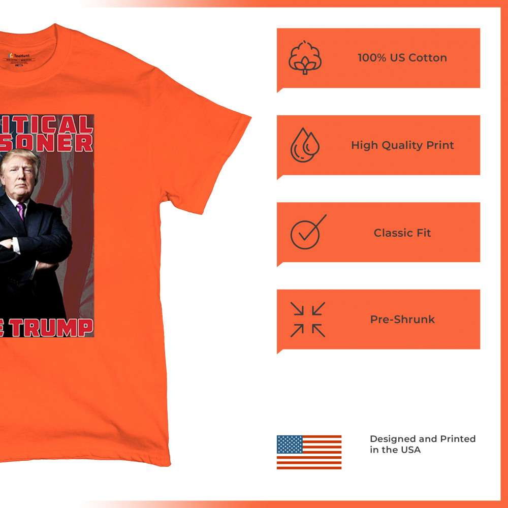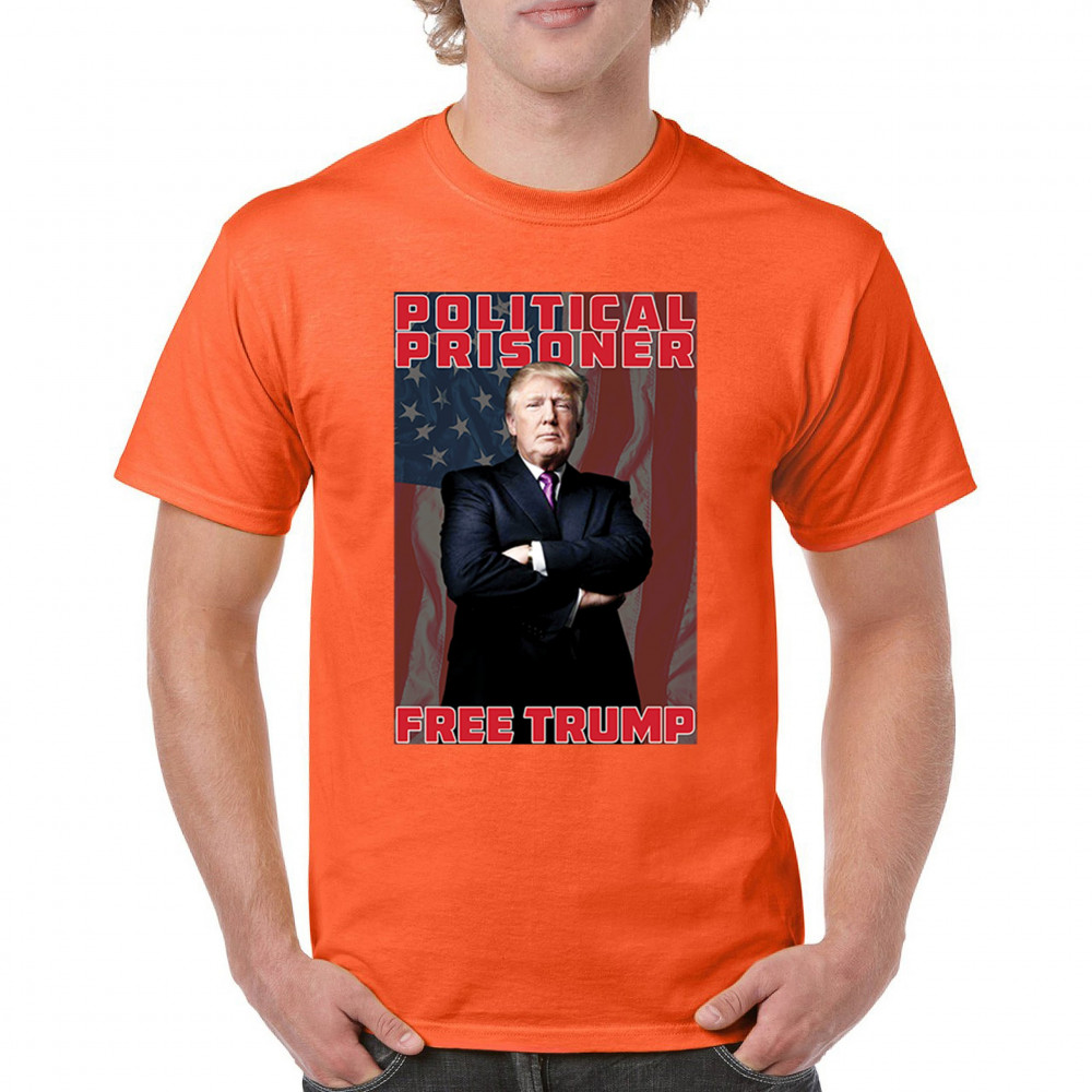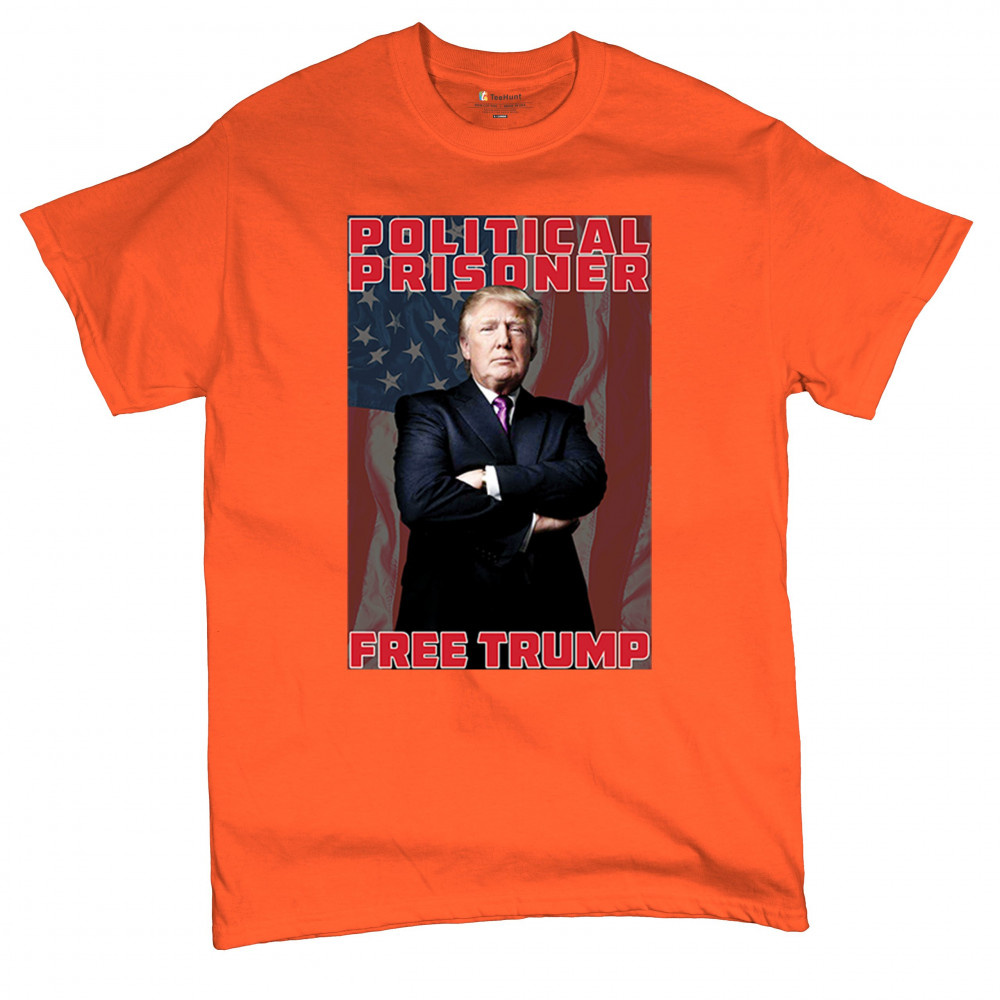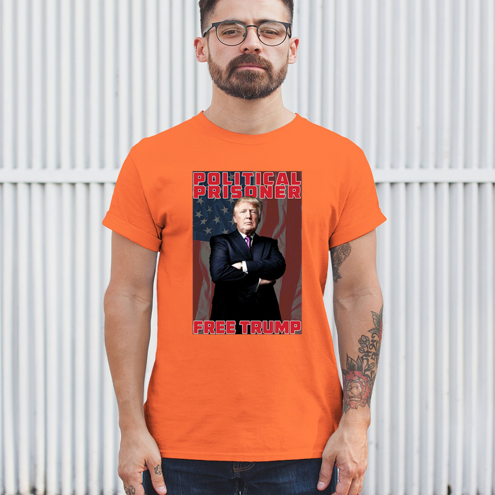 Show your support with the "Political Prisoner Free Trump" design, featuring Trump against an American flag. Perfect for conservative patriots and Trump supporters.