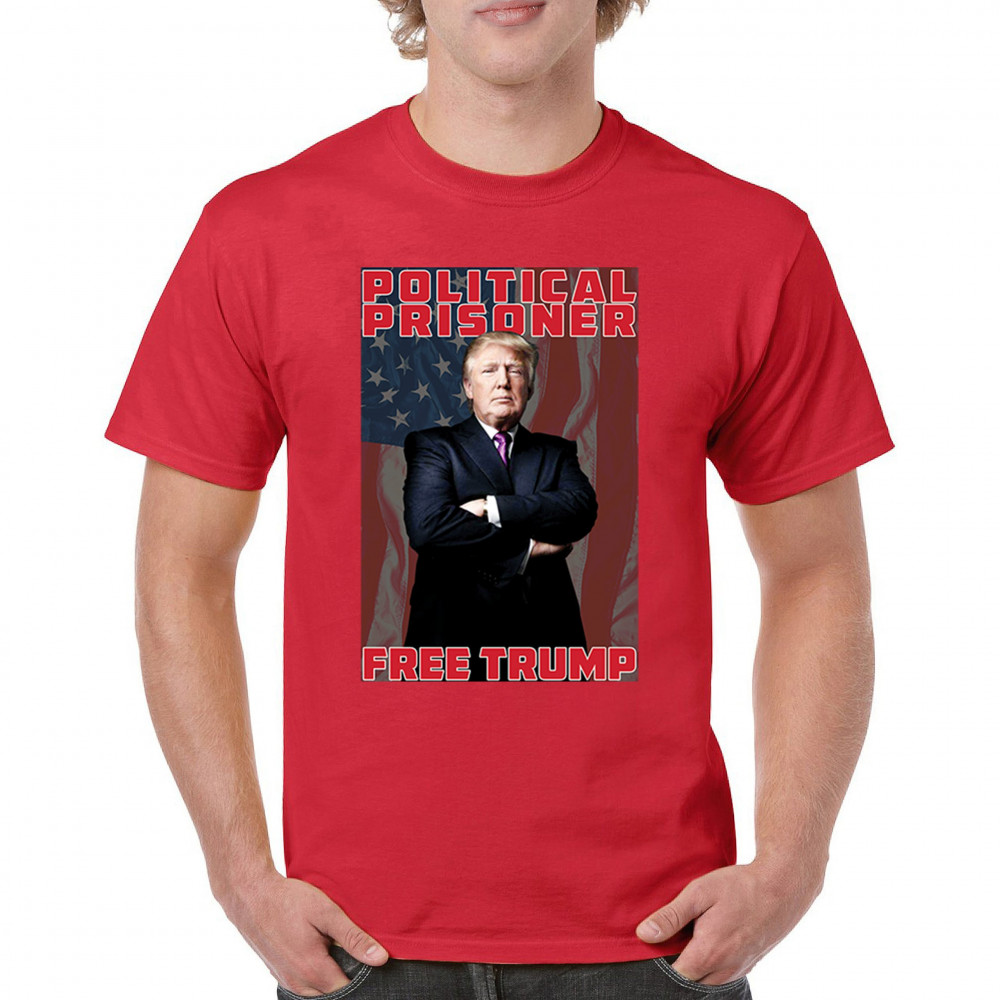 Show your support with the "Political Prisoner Free Trump" design, featuring Trump against an American flag. Perfect for conservative patriots and Trump supporters.