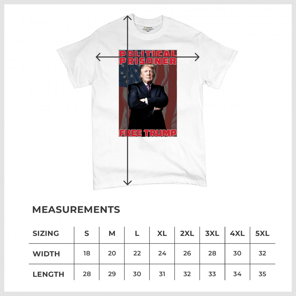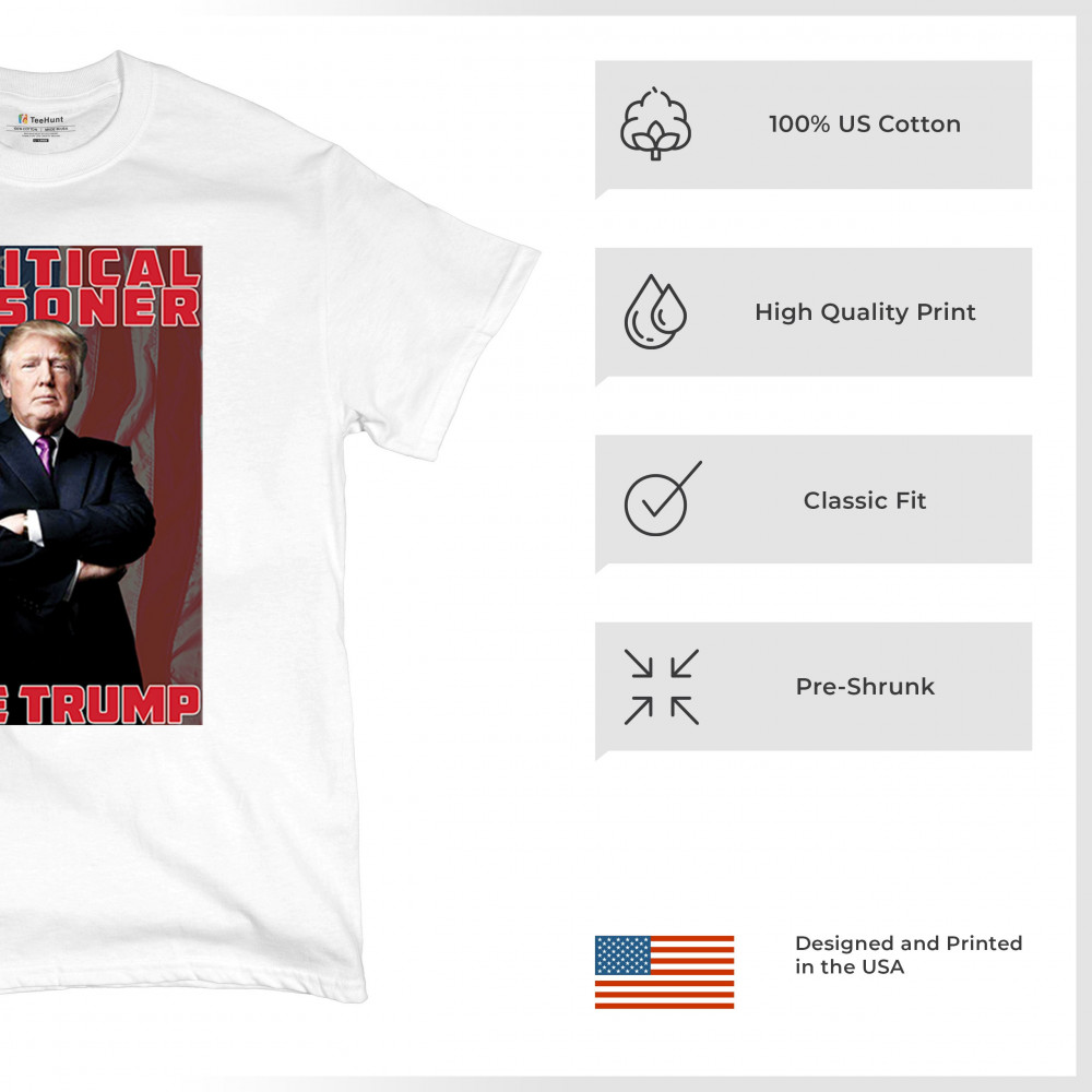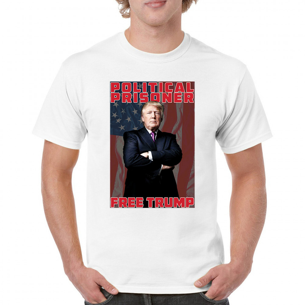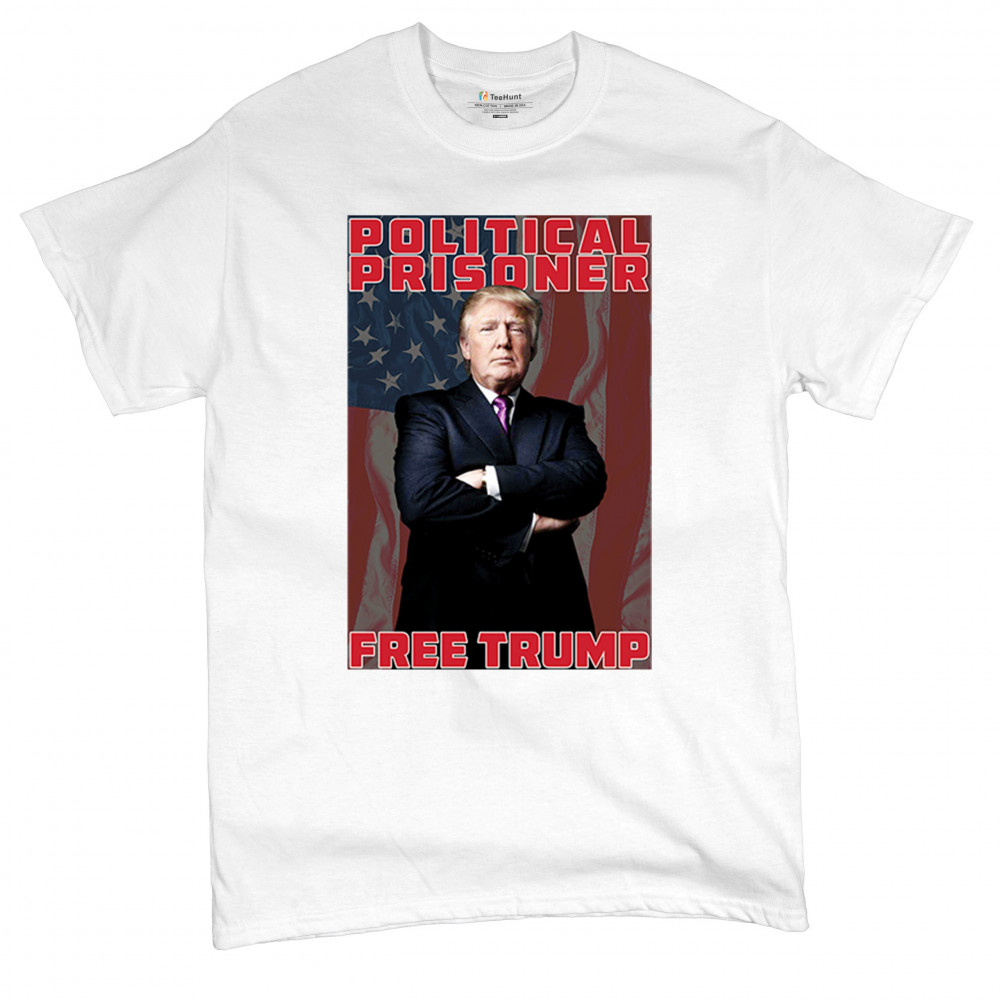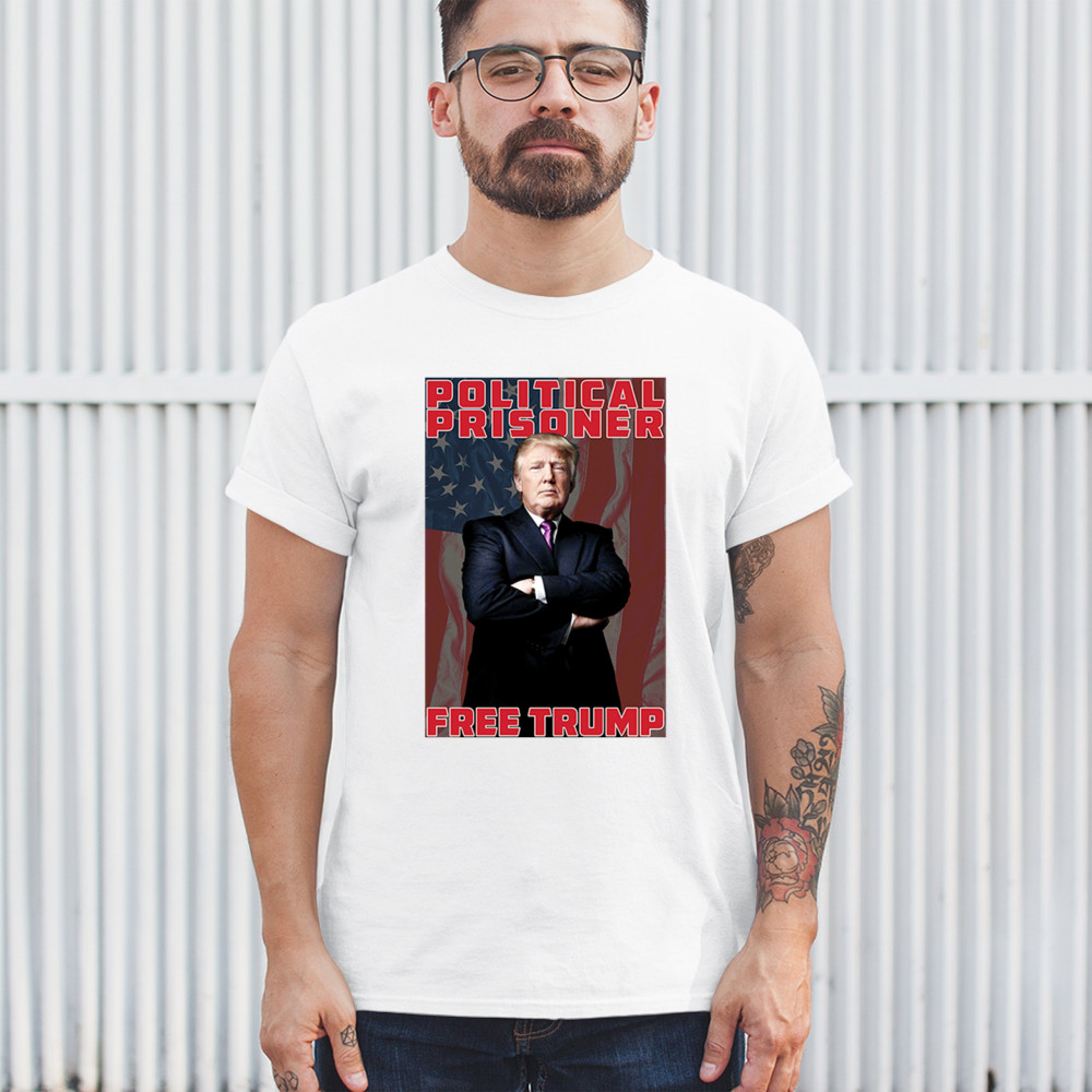 Show your support with the "Political Prisoner Free Trump" design, featuring Trump against an American flag. Perfect for conservative patriots and Trump supporters.
