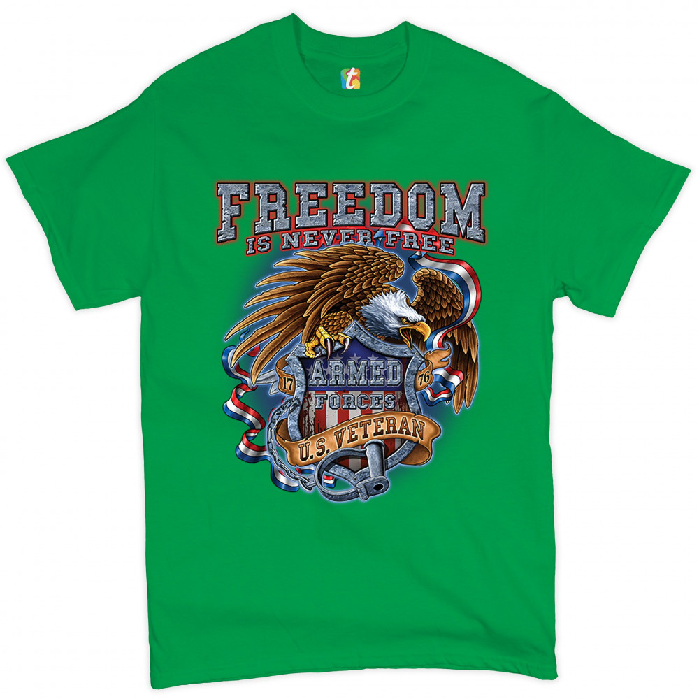 A patriotic print featuring a bald eagle holding a shield with an American Flag and "Armed Forces" written on it. The print says: "Freedom Is Never Free, 1776, U.S. Veteran". Great choice to wear on Independence Day or any other patriotic holiday.
