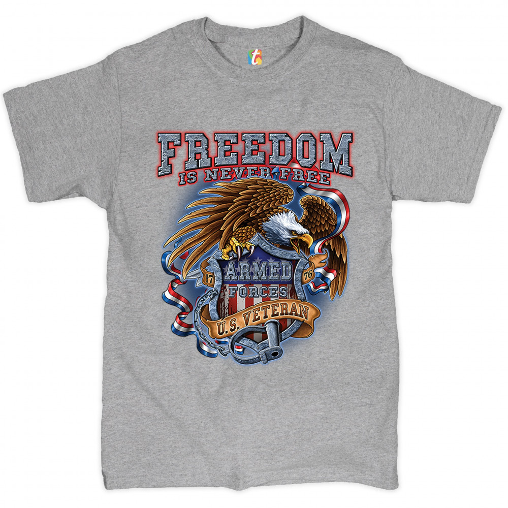 A patriotic print featuring a bald eagle holding a shield with an American Flag and "Armed Forces" written on it. The print says: "Freedom Is Never Free, 1776, U.S. Veteran". Great choice to wear on Independence Day or any other patriotic holiday.