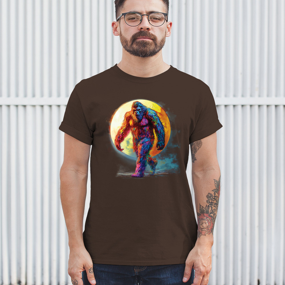 Rainbow Bigfoot under full moon design for cryptid lovers, festival goers, and psychedelic art fans. Bold, surreal, and eye-catching.