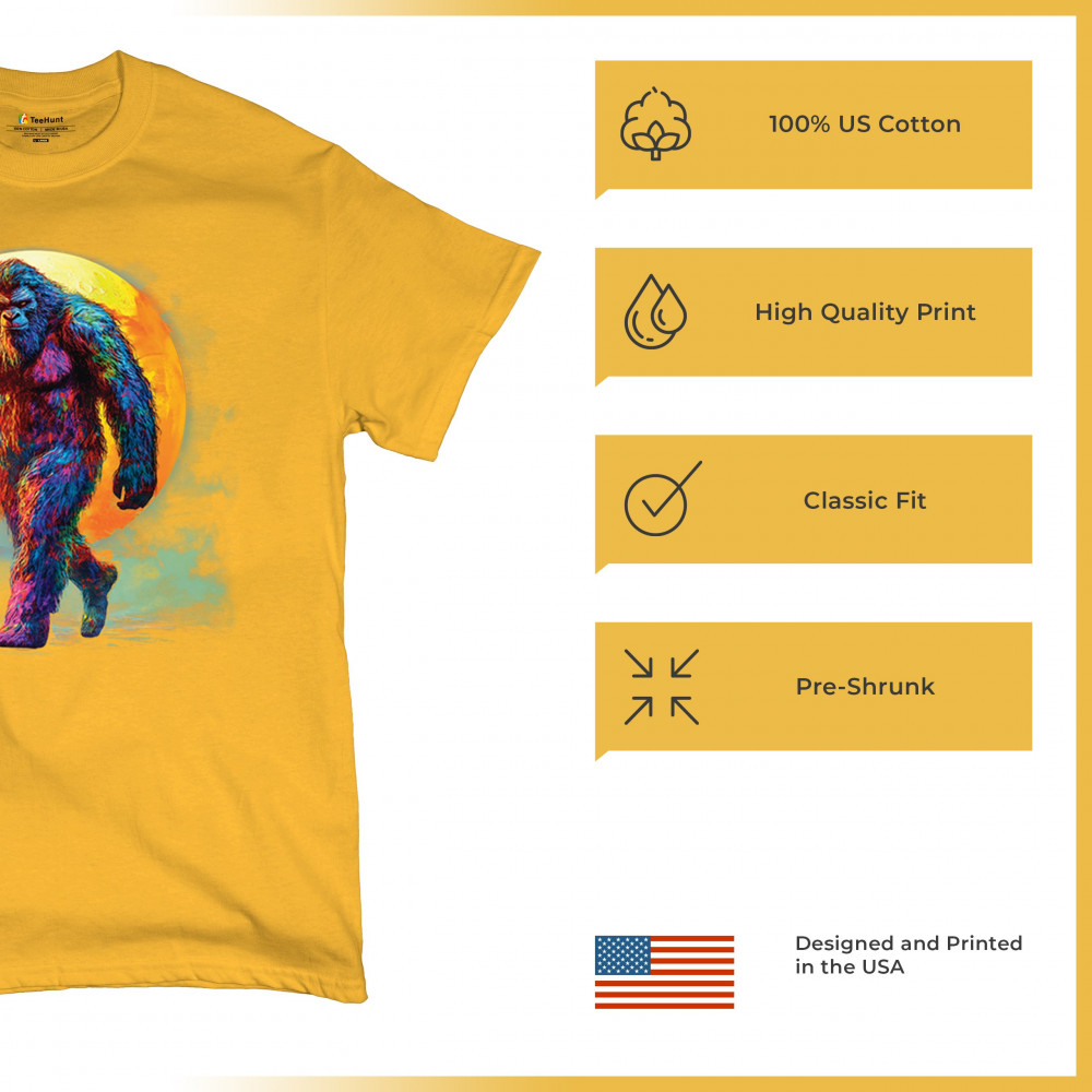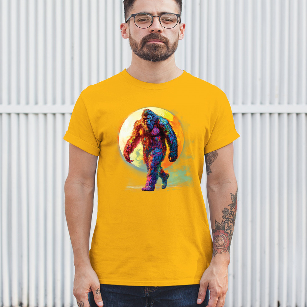 Rainbow Bigfoot under full moon design for cryptid lovers, festival goers, and psychedelic art fans. Bold, surreal, and eye-catching.