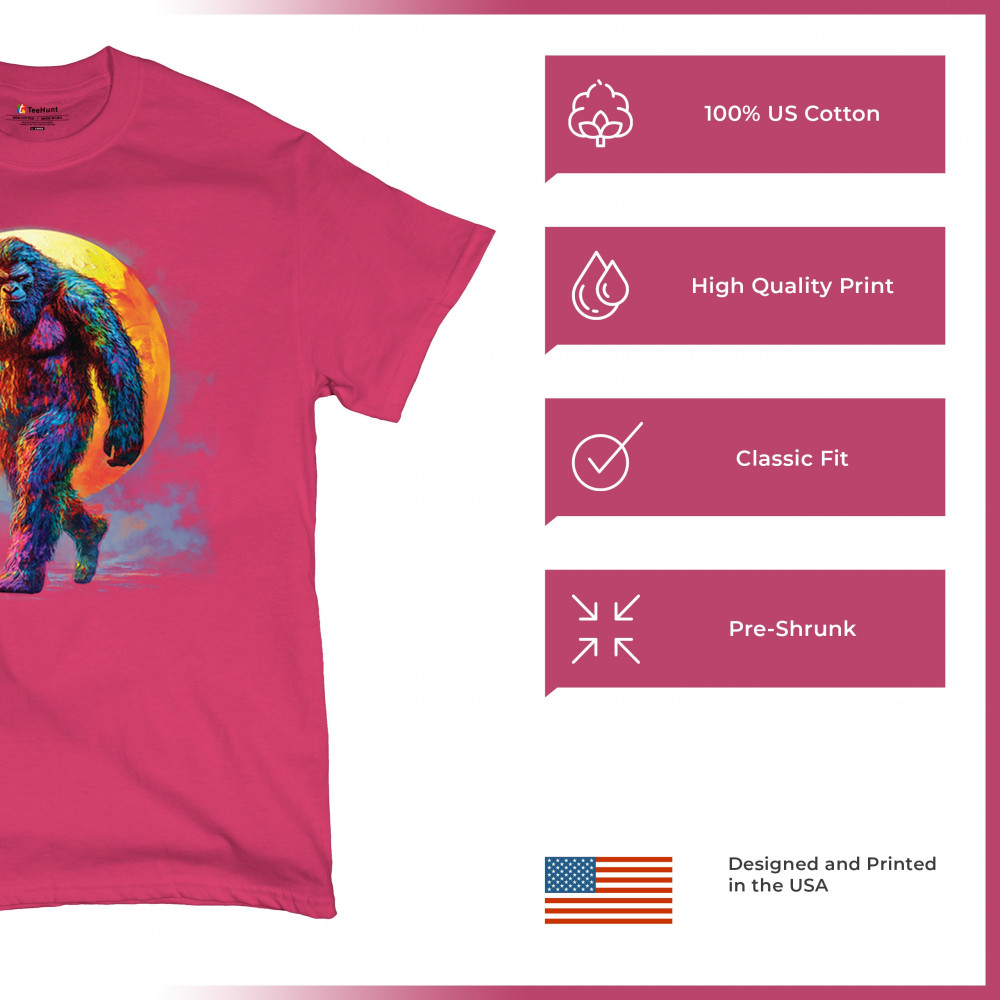 Rainbow Bigfoot under full moon design for cryptid lovers, festival goers, and psychedelic art fans. Bold, surreal, and eye-catching.