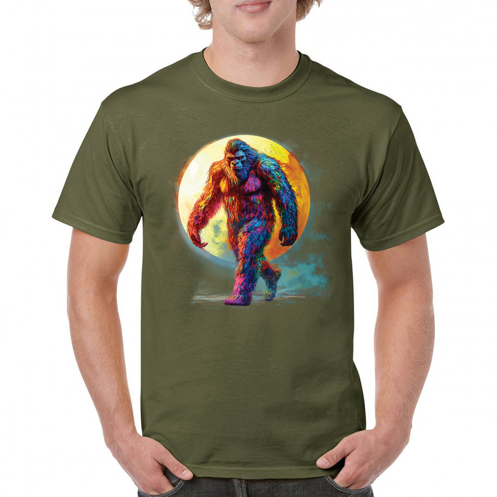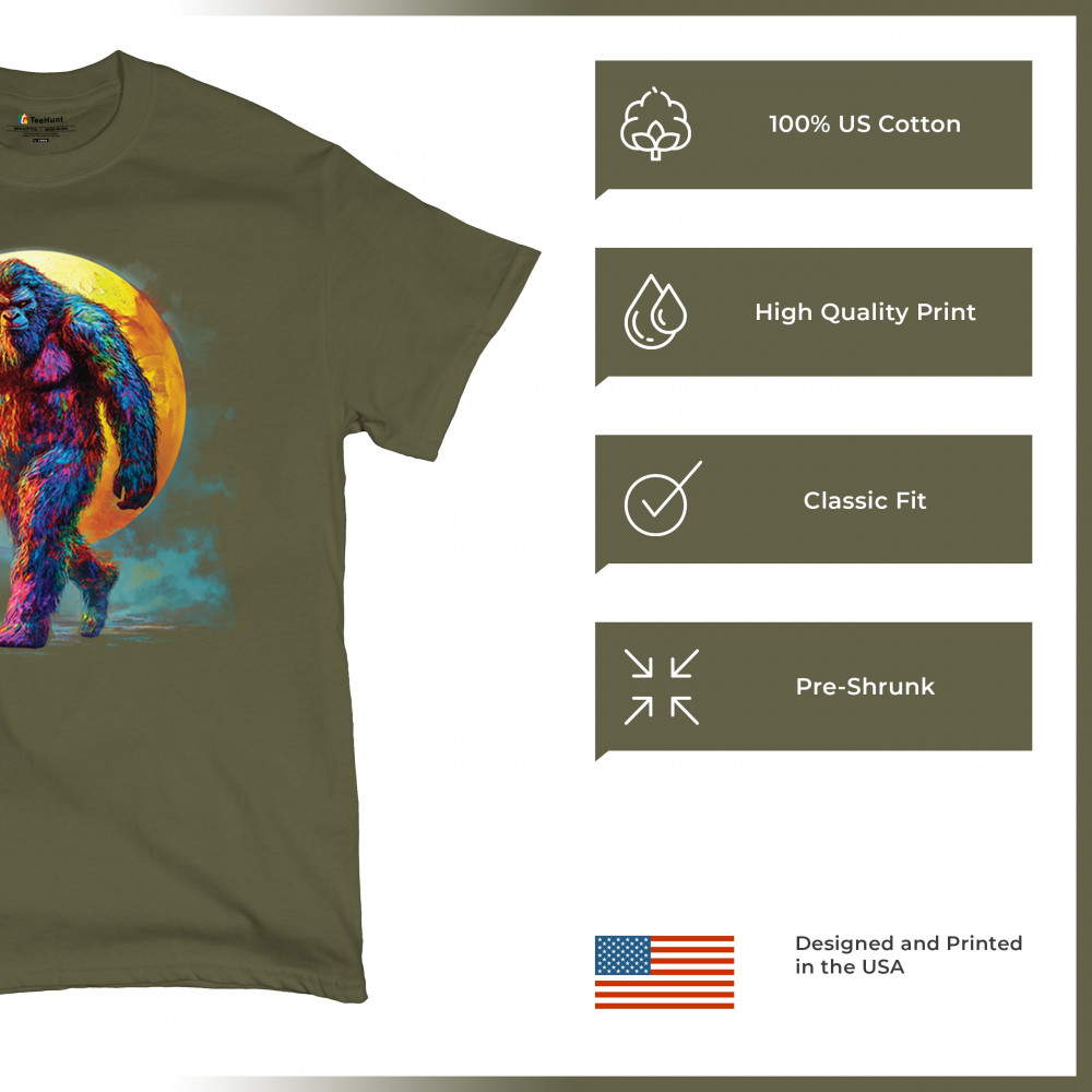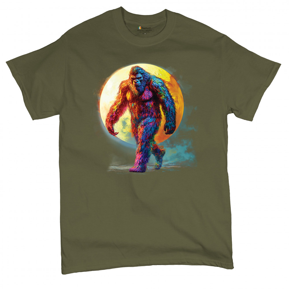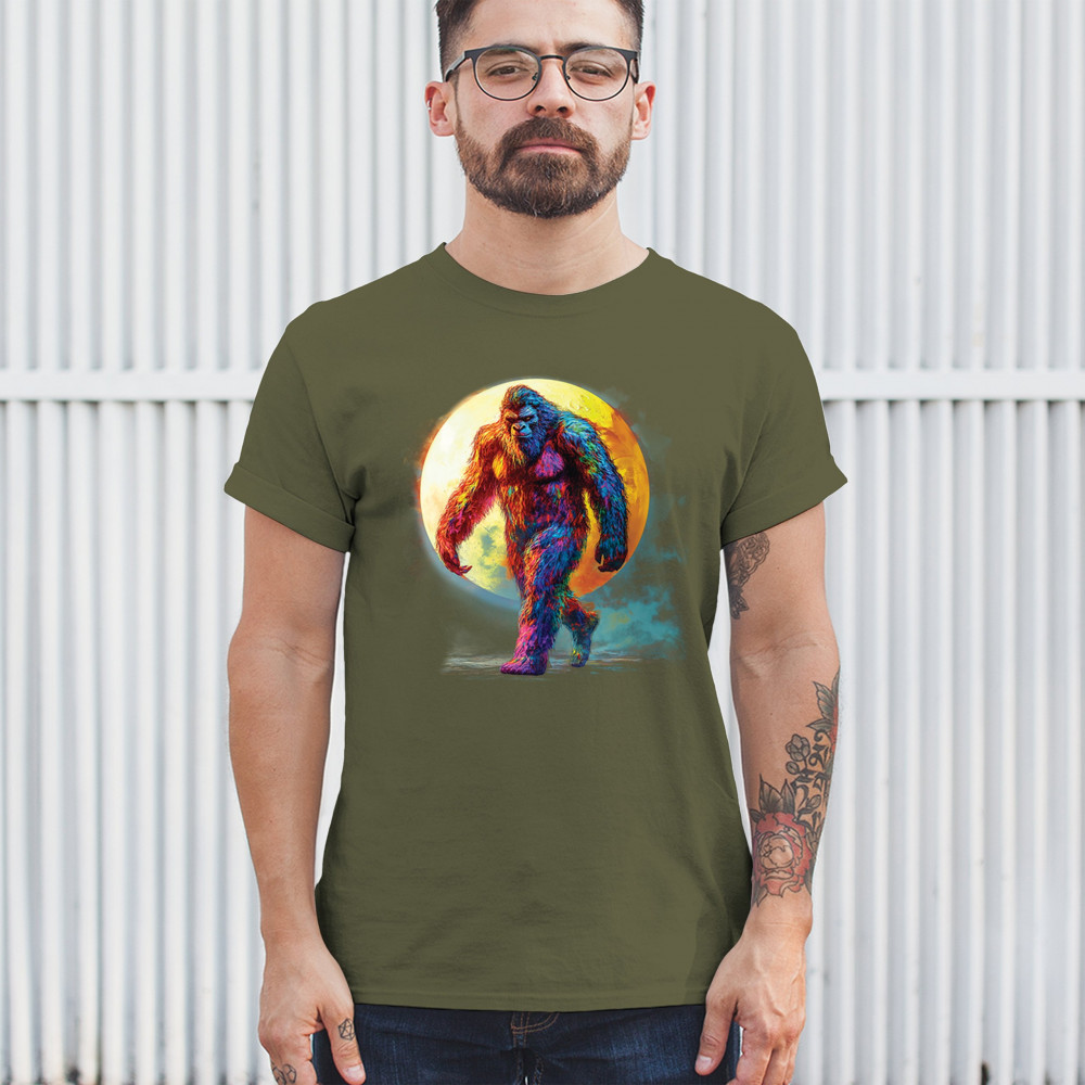 Rainbow Bigfoot under full moon design for cryptid lovers, festival goers, and psychedelic art fans. Bold, surreal, and eye-catching.