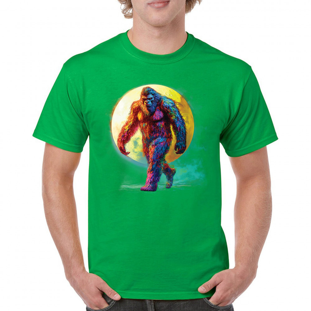Step into a vivid cryptid dream with this rainbow Bigfoot design. Featuring a multicolor Sasquatch walking past a full moon, it fuses mythical mystery with bold, surreal art. Perfect for festival fans, night hikers, and lovers of the unexplained, this design brings eye-catching style to your wild side.