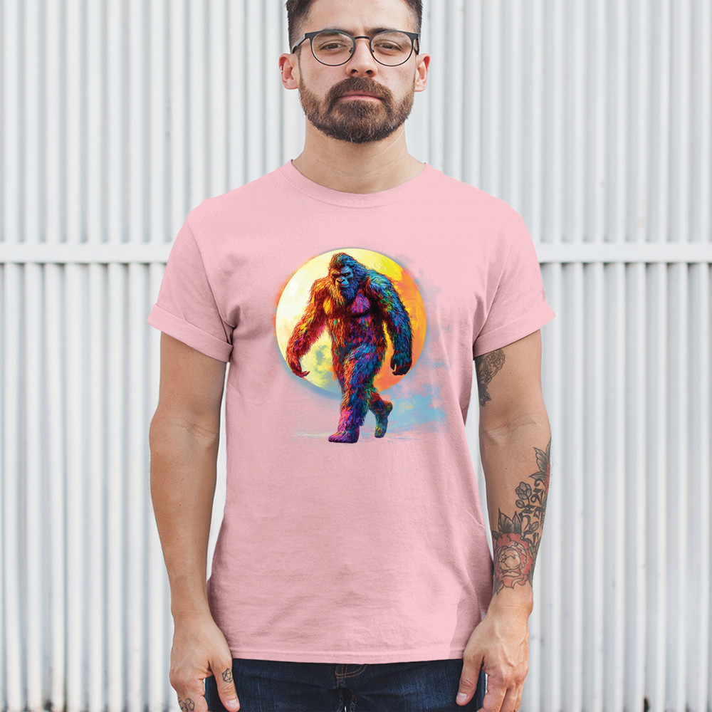 Rainbow Bigfoot under full moon design for cryptid lovers, festival goers, and psychedelic art fans. Bold, surreal, and eye-catching.