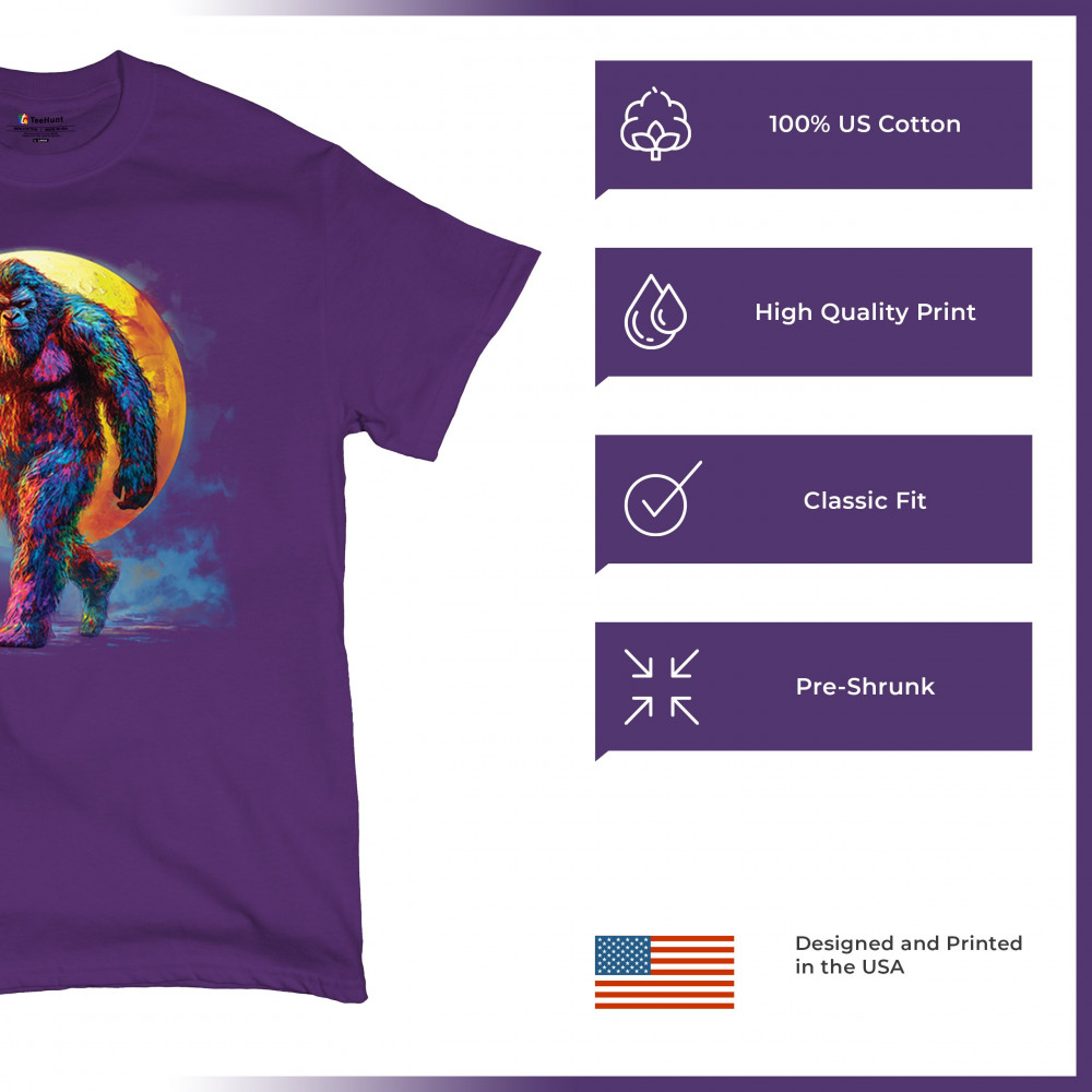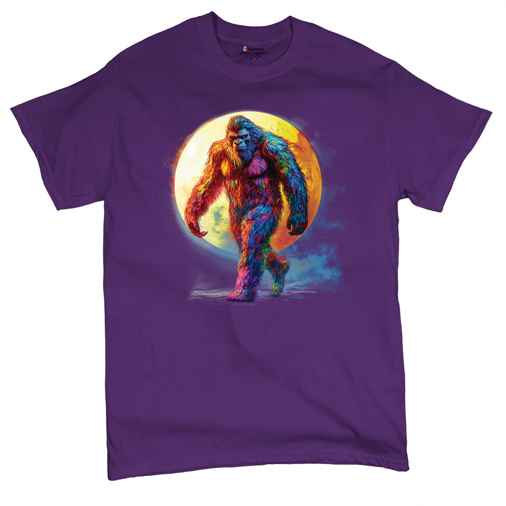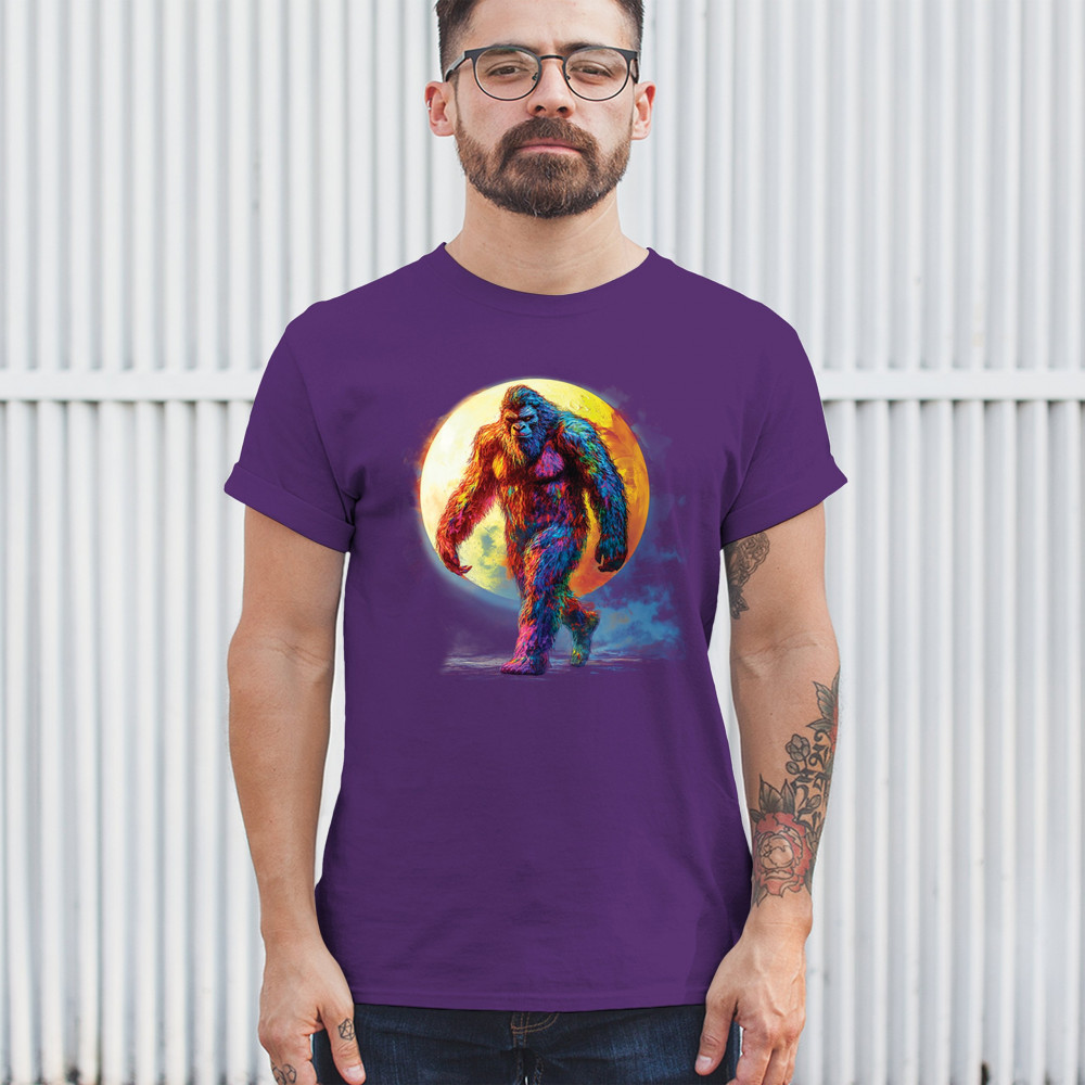 Rainbow Bigfoot under full moon design for cryptid lovers, festival goers, and psychedelic art fans. Bold, surreal, and eye-catching.