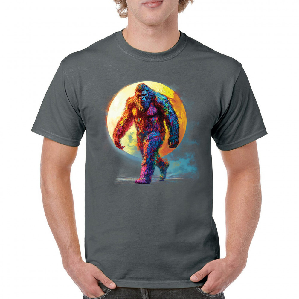 Rainbow Bigfoot under full moon design for cryptid lovers, festival goers, and psychedelic art fans. Bold, surreal, and eye-catching.