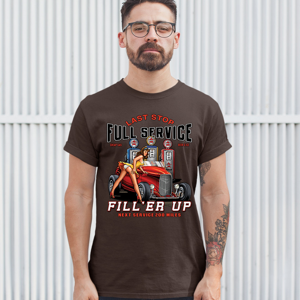 A print featuring a hot pin-up girl leaning on a convertible coupe hot rod with a registration plate saying "cool". In the background there are several gas stations. The print says: "Last Stop, Full Service, Cheap Gas, Beer & Ice, Fill 'Er Up, Next Servic