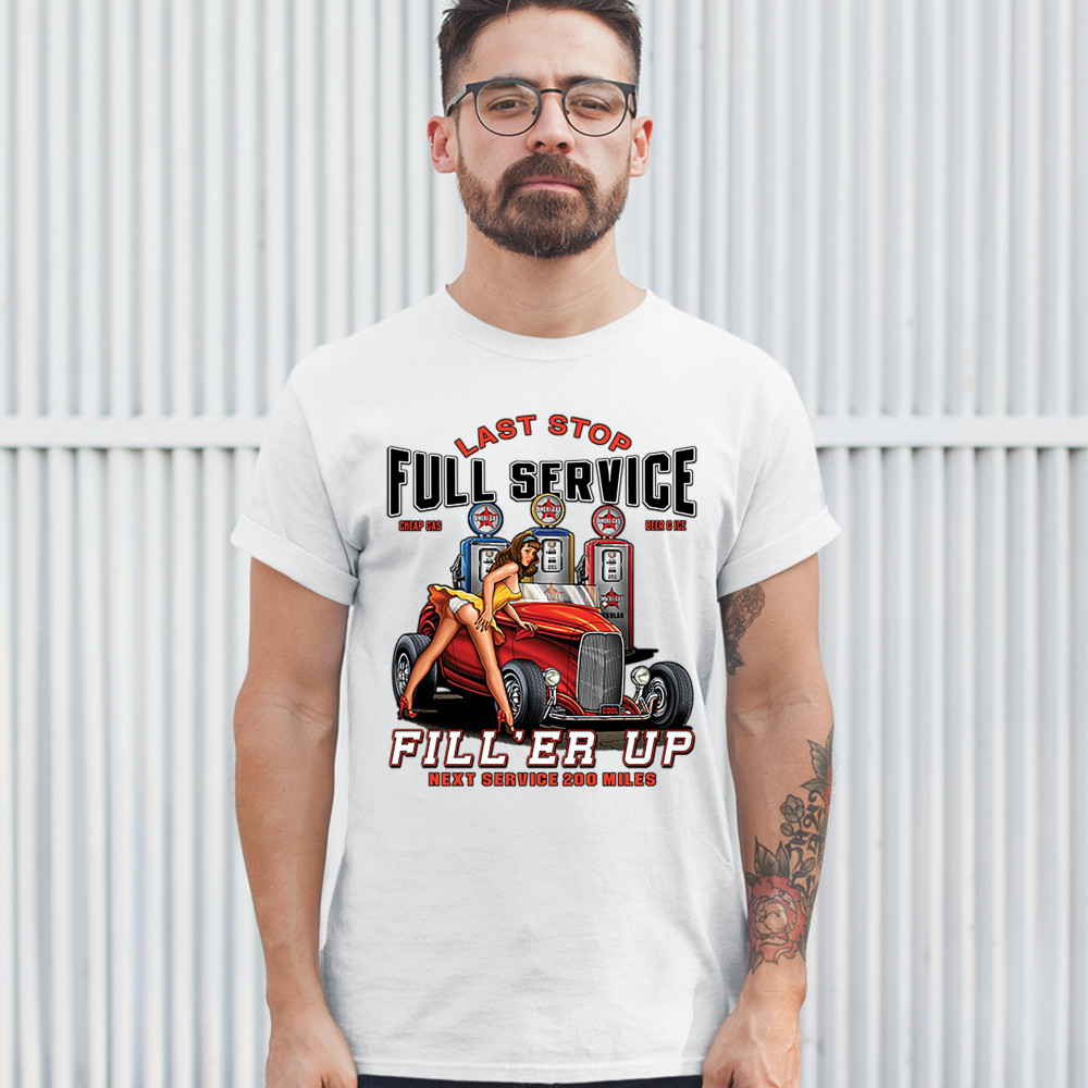 A print featuring a hot pin-up girl leaning on a convertible coupe hot rod with a registration plate saying "cool". In the background there are several gas stations. The print says: "Last Stop, Full Service, Cheap Gas, Beer & Ice, Fill 'Er Up, Next Servic