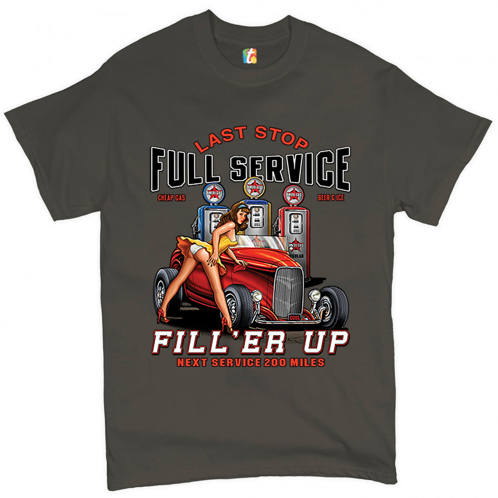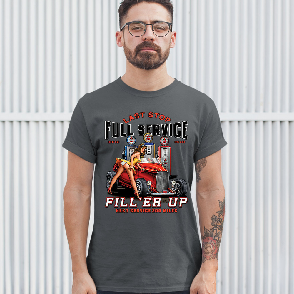 A print featuring a hot pin-up girl leaning on a convertible coupe hot rod with a registration plate saying "cool". In the background there are several gas stations. The print says: "Last Stop, Full Service, Cheap Gas, Beer & Ice, Fill 'Er Up, Next Servic