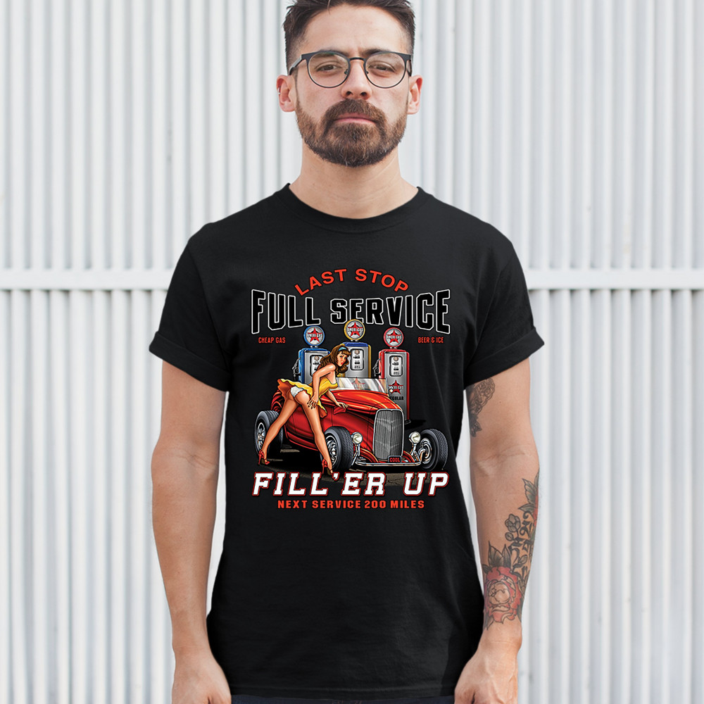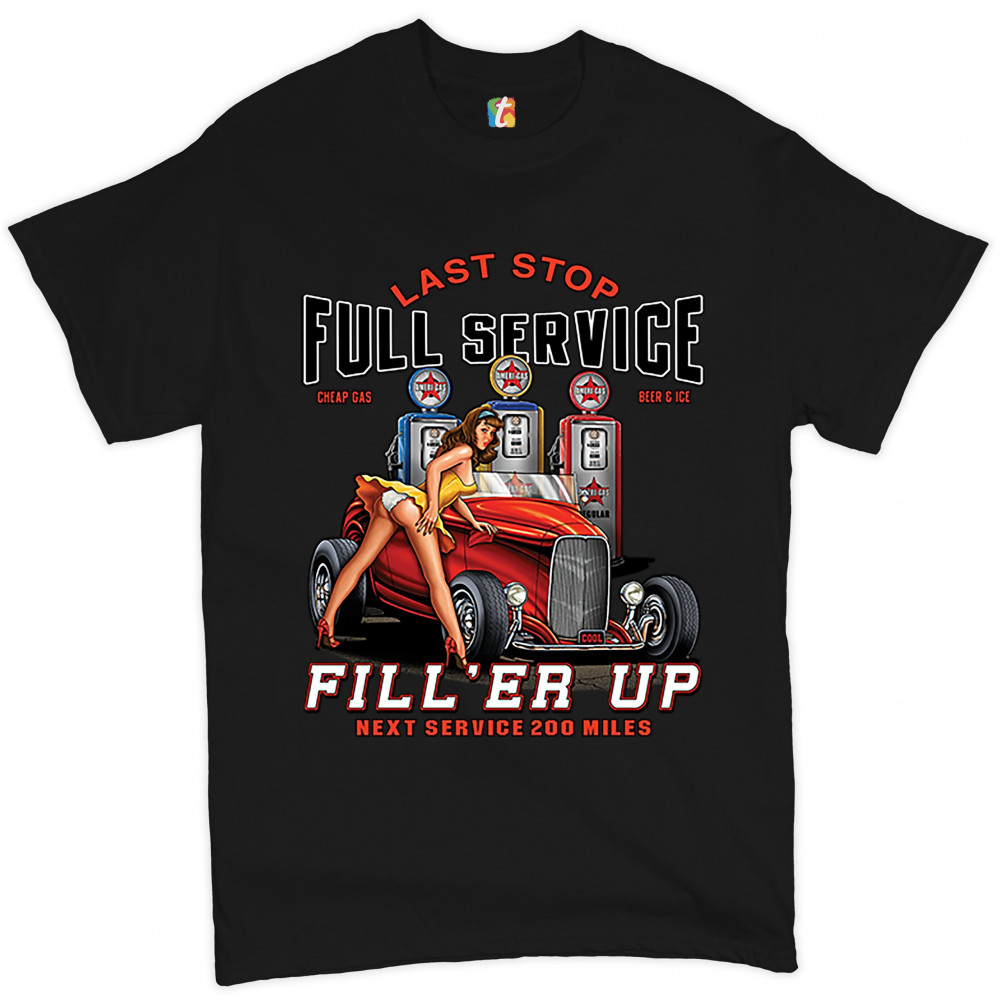 A print featuring a hot pin-up girl leaning on a convertible coupe hot rod with a registration plate saying "cool". In the background there are several gas stations. The print says: "Last Stop, Full Service, Cheap Gas, Beer & Ice, Fill 'Er Up, Next Servic
