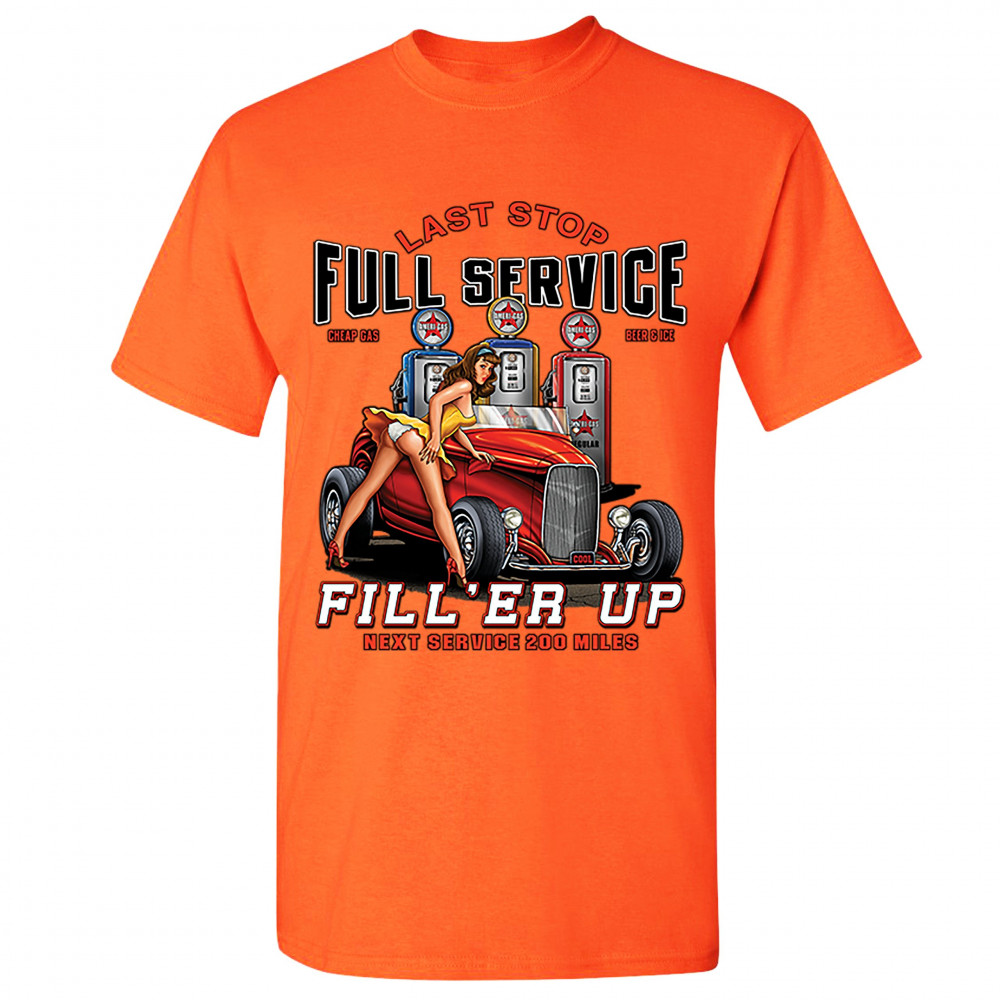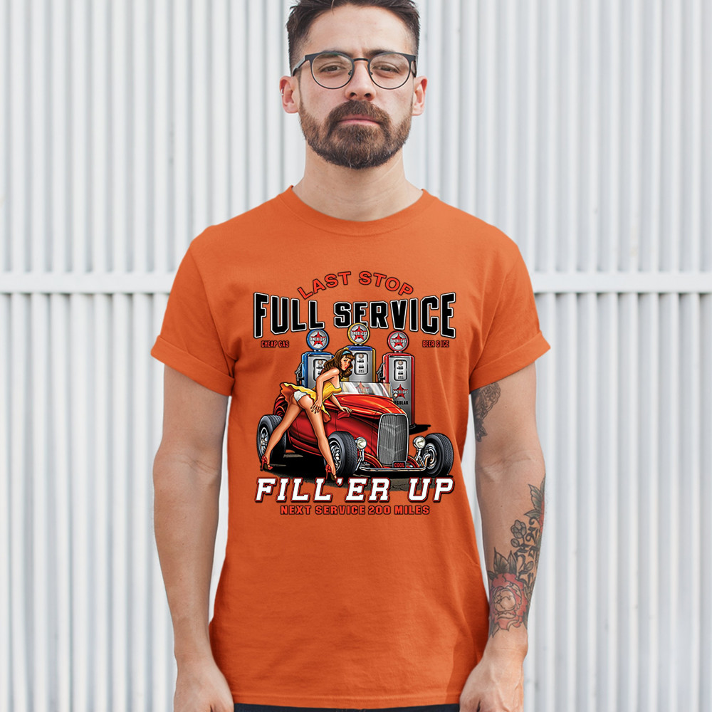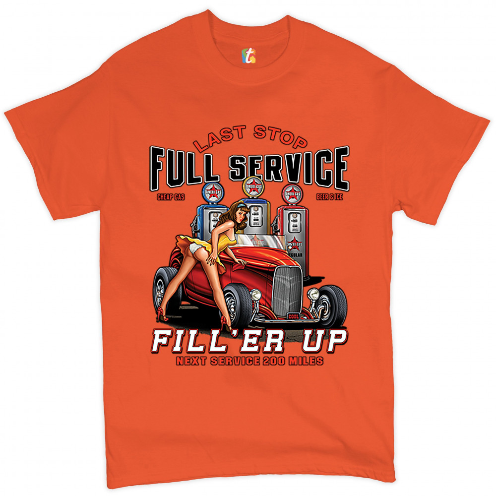 A print featuring a hot pin-up girl leaning on a convertible coupe hot rod with a registration plate saying "cool". In the background there are several gas stations. The print says: "Last Stop, Full Service, Cheap Gas, Beer & Ice, Fill 'Er Up, Next Servic