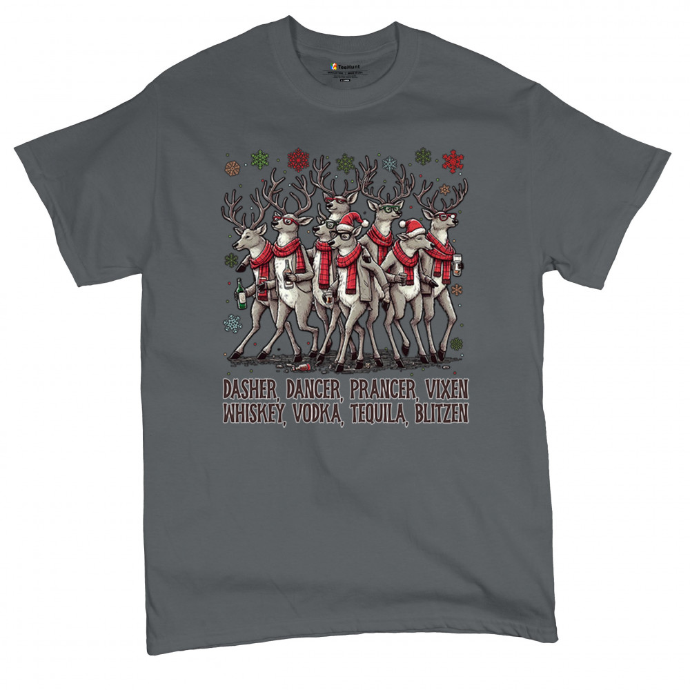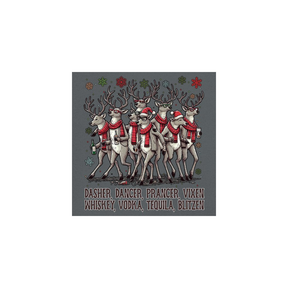 This funny holiday design features a squad of drinking reindeer carrying bottles and dressed in scarves for the ultimate Christmas party vibe. Great for bar crawls, office parties, winter gatherings, adult holiday events, white elephant exchanges, festive nights out, and anyone who loves spirited Christmas humor with a cheeky personality.