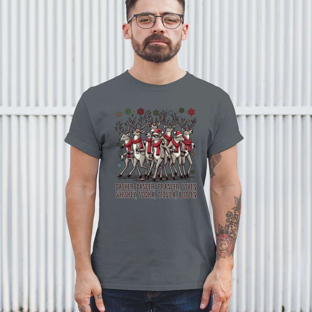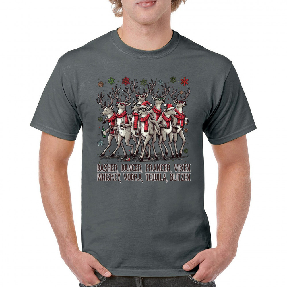 Funny drinking-reindeer Christmas design perfect for parties, bar crawls, and festive adult humor. Great for holiday laughs and spirited winter fun.