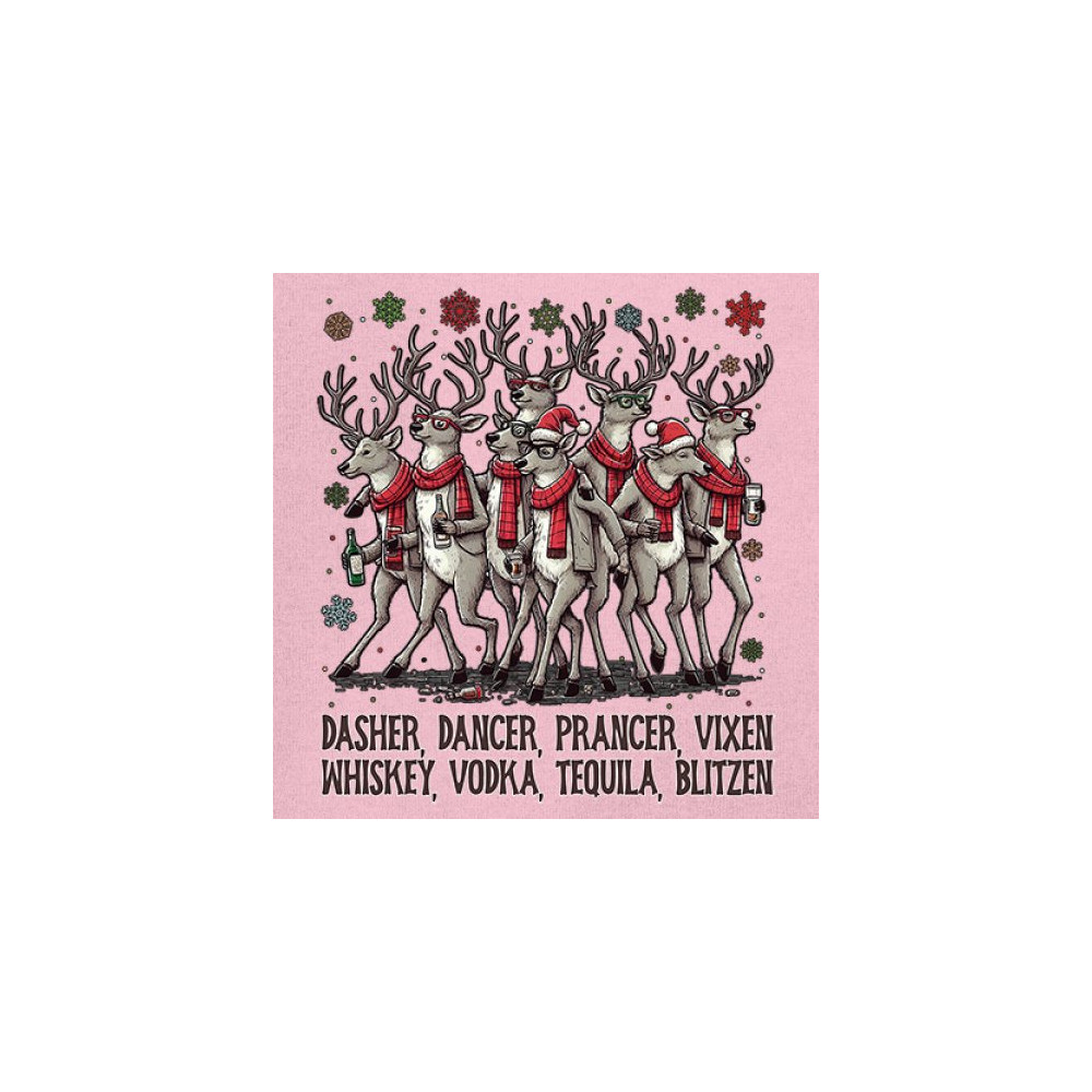 This funny holiday design features a squad of drinking reindeer carrying bottles and dressed in scarves for the ultimate Christmas party vibe. Great for bar crawls, office parties, winter gatherings, adult holiday events, white elephant exchanges, festive nights out, and anyone who loves spirited Christmas humor with a cheeky personality.