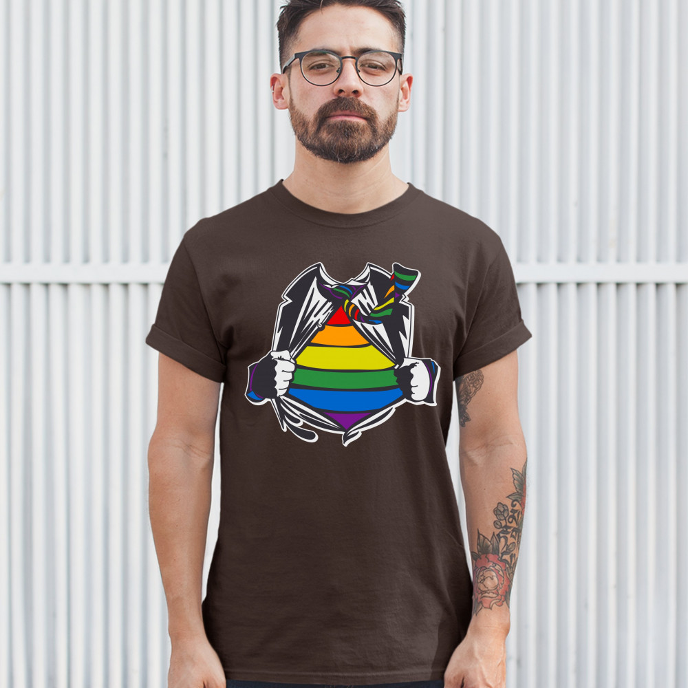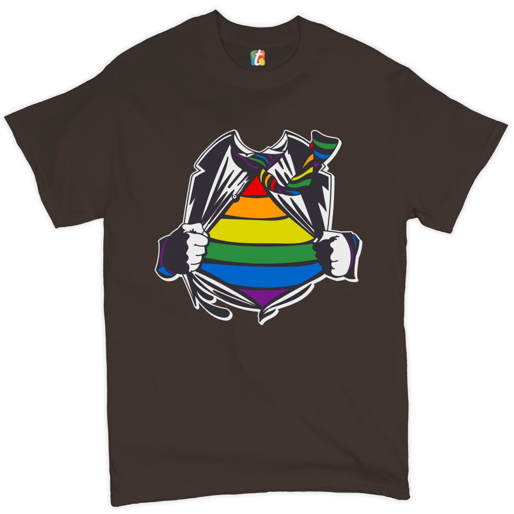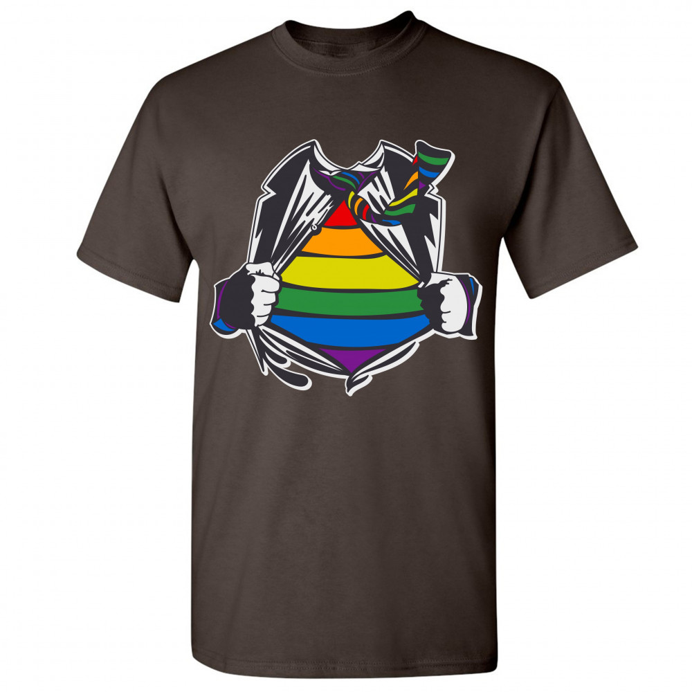 GAY SUPERHERO PARODY t-shirt lesbian bi transgender pride rainbow men's tee brown