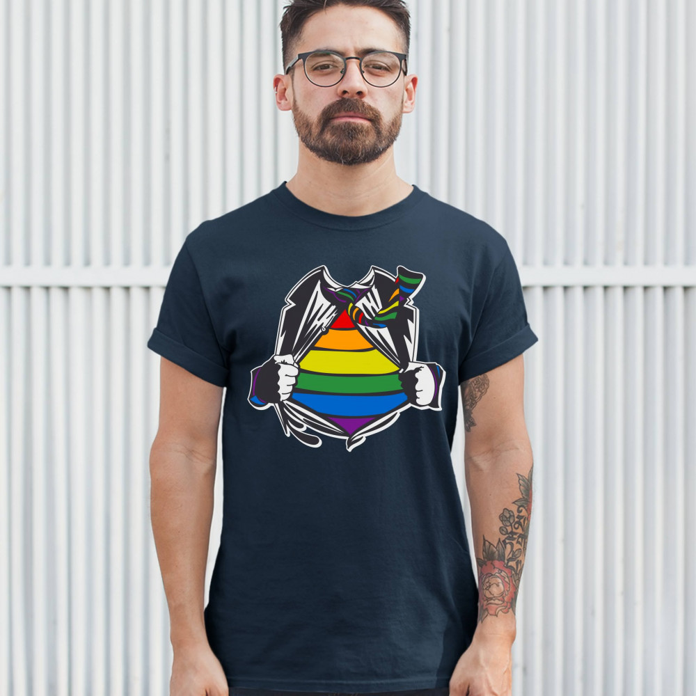 GAY SUPERHERO PARODY t-shirt lesbian bi transgender pride rainbow men's tee navy blue