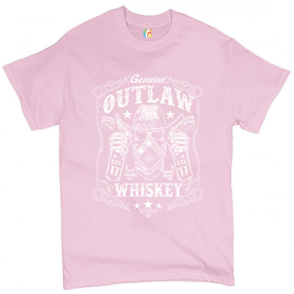 A print featuring a skeleton wearing a bandana and a cowboy hat holding a bottle in each of it's hands. The print says: "Genuine Outlaw Whiskey, Handmade Sour Mash, 100 Proof Moonshine". A great choice for an old school person who doesn't mind a glass or