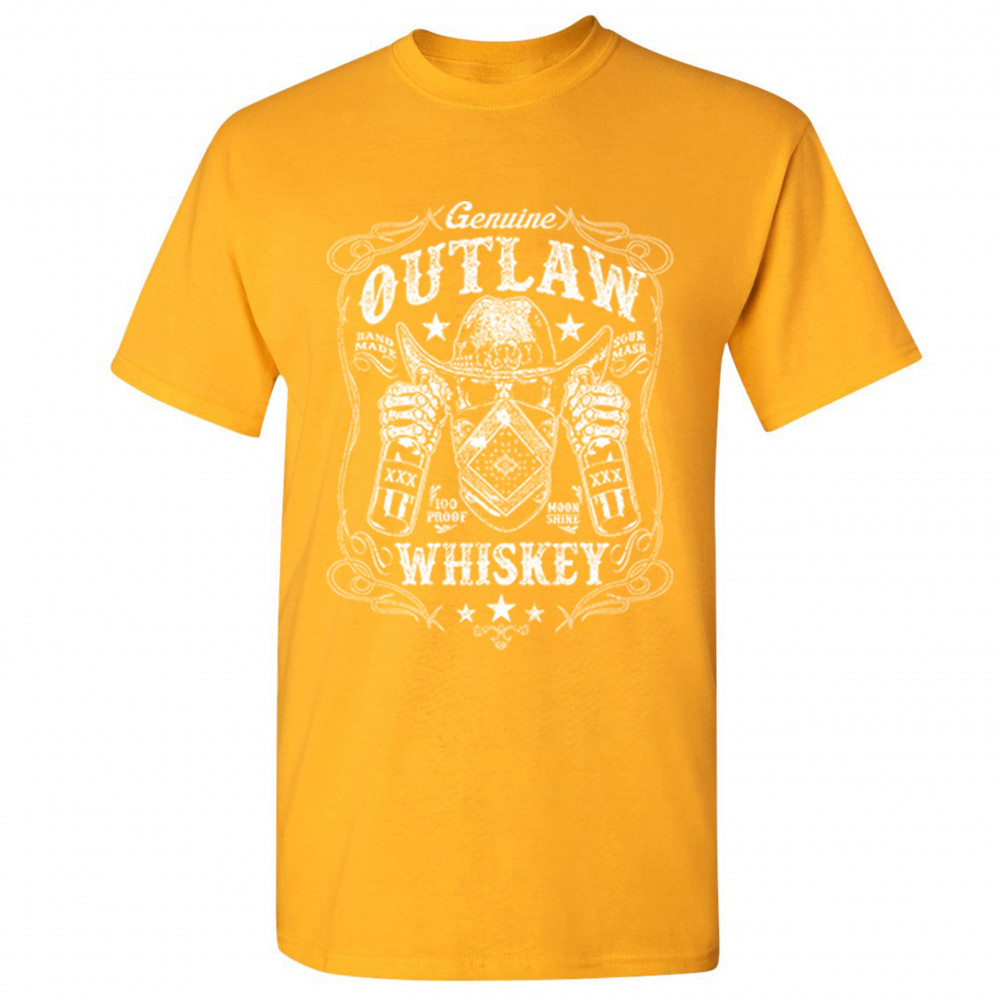 A print featuring a skeleton wearing a bandana and a cowboy hat holding a bottle in each of it's hands. The print says: "Genuine Outlaw Whiskey, Handmade Sour Mash, 100 Proof Moonshine". A great choice for an old school person who doesn't mind a glass or