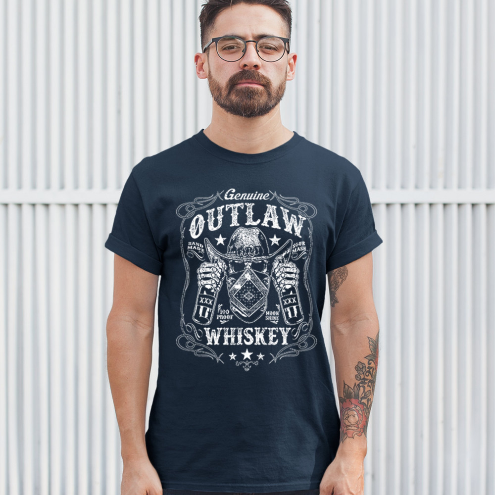 A print featuring a skeleton wearing a bandana and a cowboy hat holding a bottle in each of it's hands. The print says: "Genuine Outlaw Whiskey, Handmade Sour Mash, 100 Proof Moonshine". A great choice for an old school person who doesn't mind a glass or