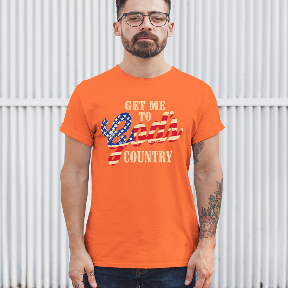 Bold patriotic faith shirt featuring USA flag text. Great for rural life, Christian pride, believers, and country-loving Americans.
