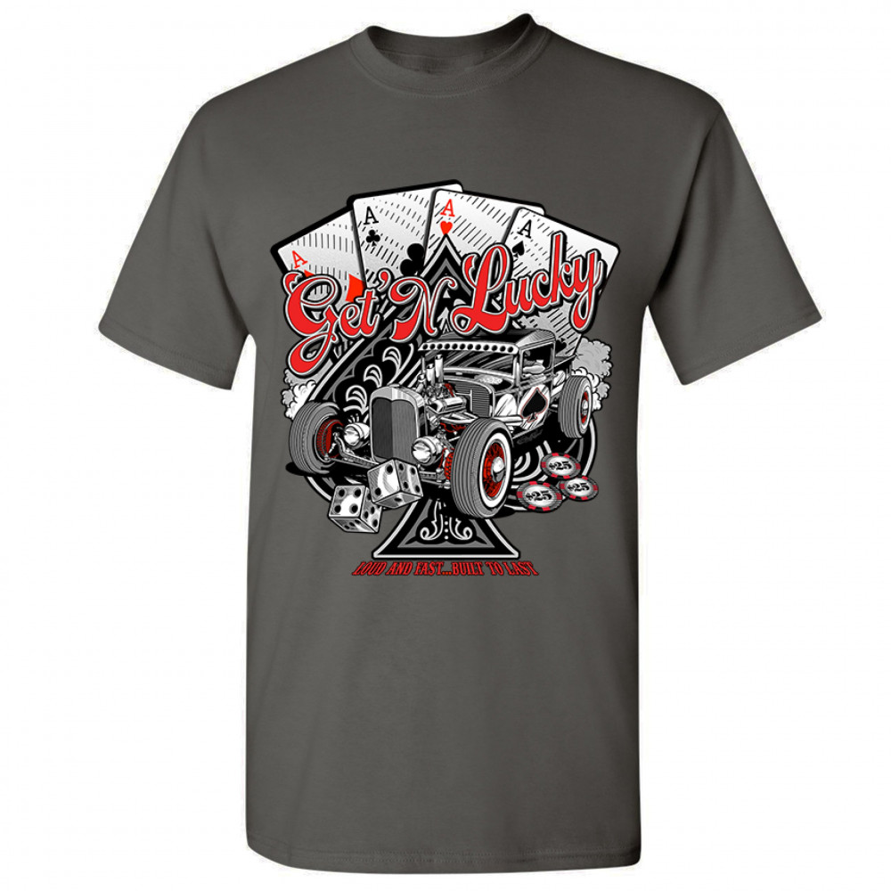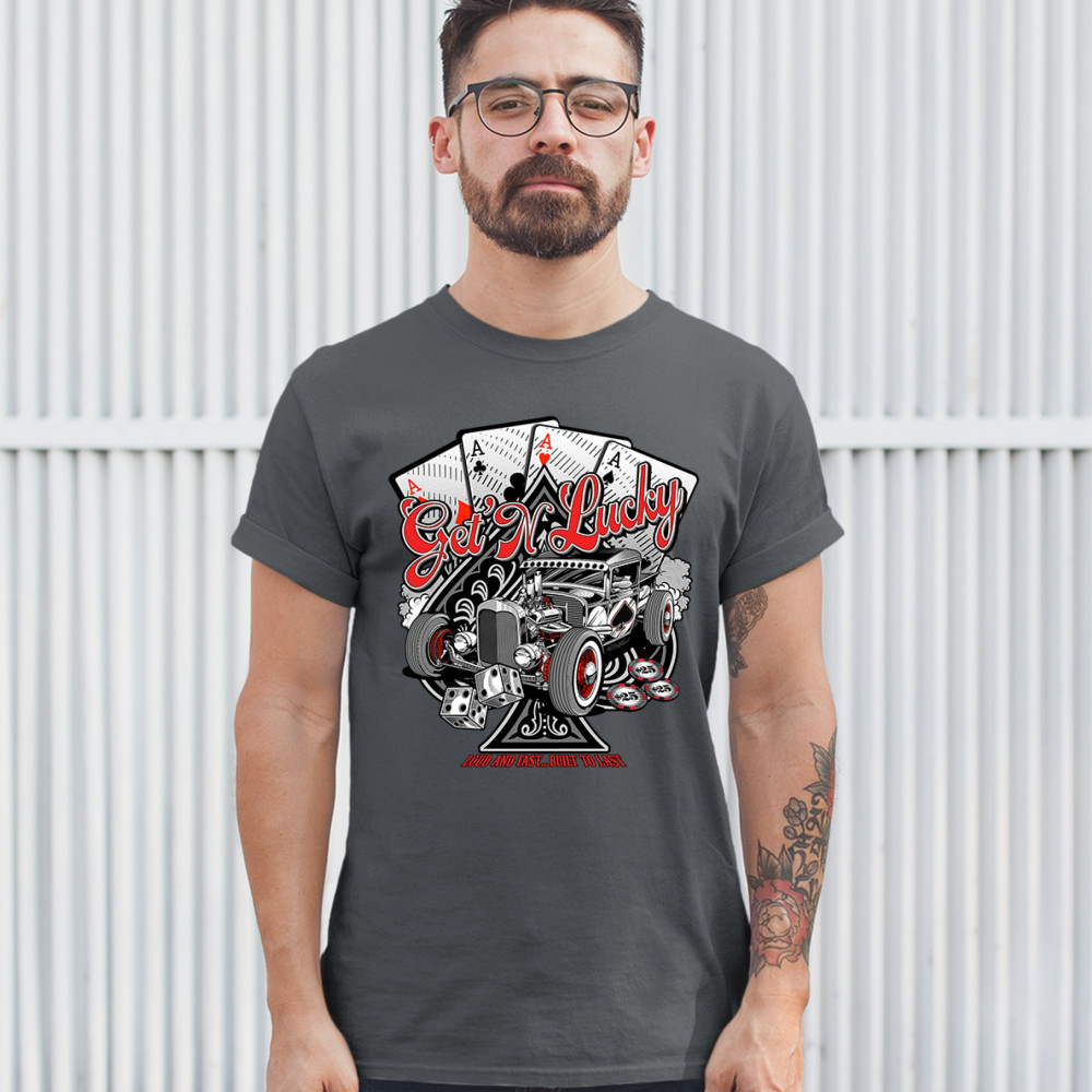 A print featuring a hot rod and a giant ace of spades behind it. In the background there are four aces of every suit. In front of the car there are 2 dices and several casino chips. The print says: "Get'n lucky, louad and fast… built to last". A great cho
