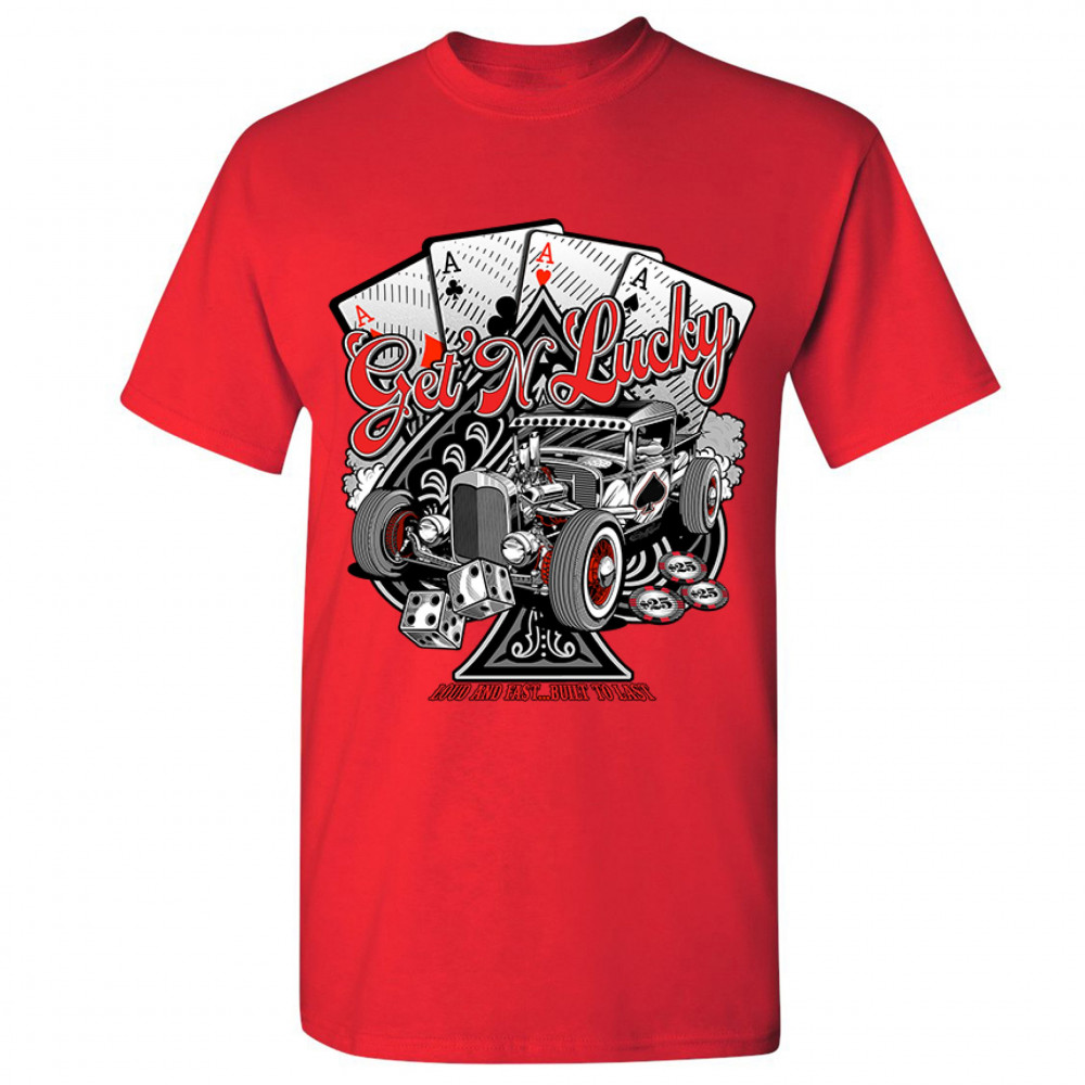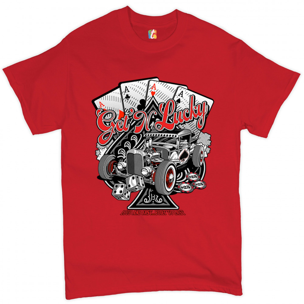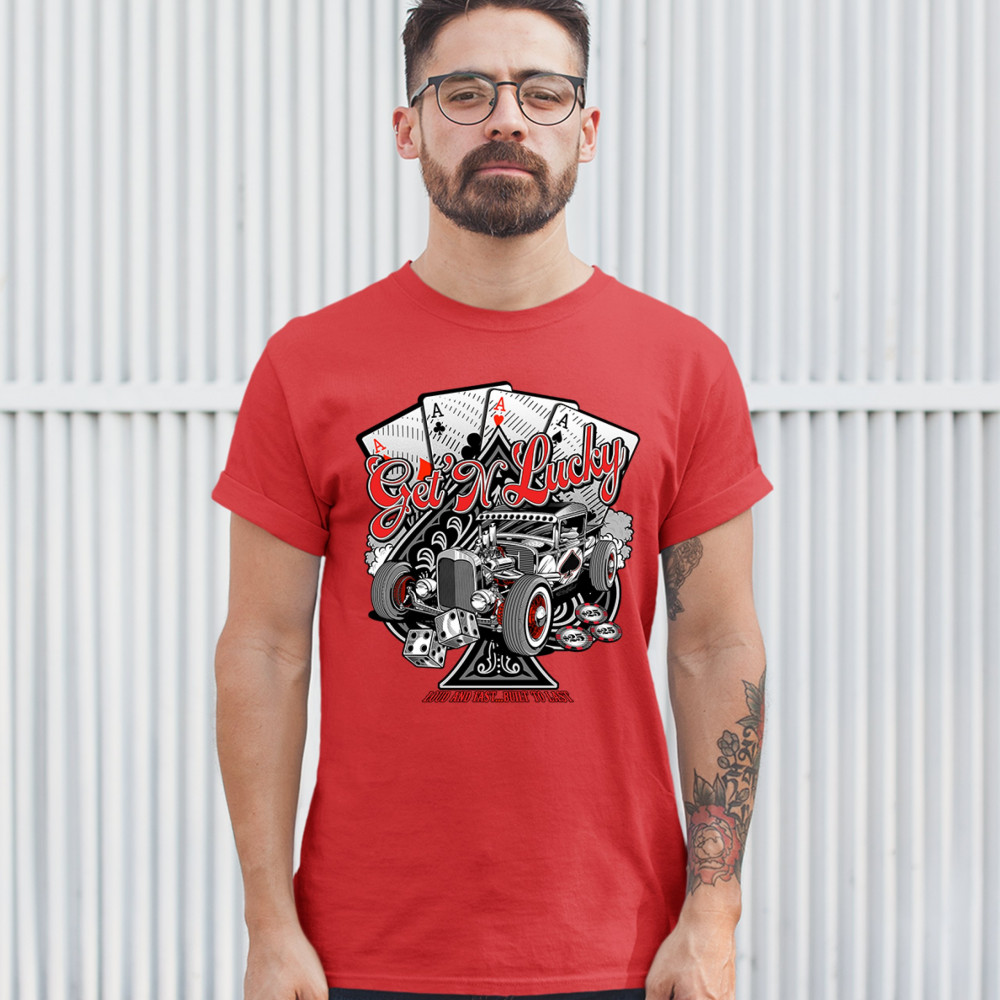 A print featuring a hot rod and a giant ace of spades behind it. In the background there are four aces of every suit. In front of the car there are 2 dices and several casino chips. The print says: "Get'n lucky, louad and fast… built to last". A great cho