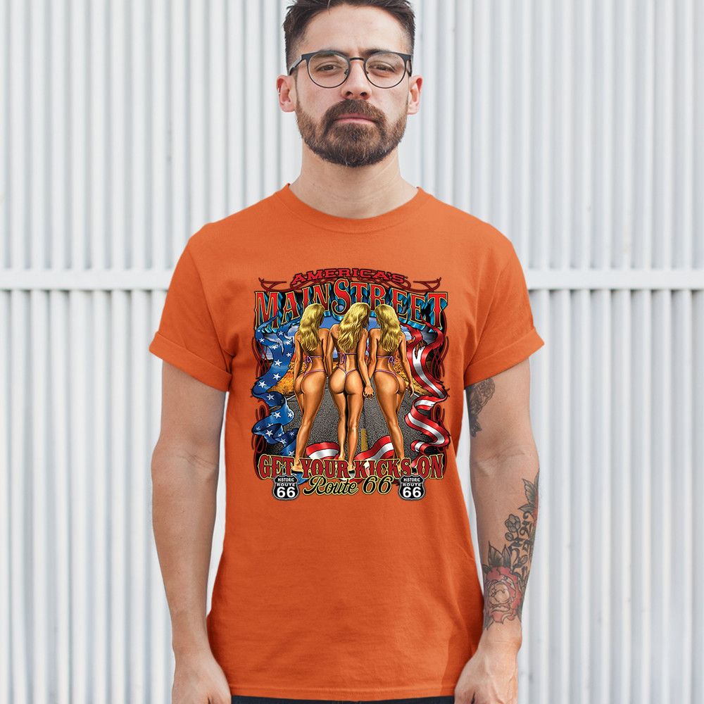 A print featuring three scantily-clad blondes holding each other's hands walking on a highway. The print says: "America's Main Street, Get Your Kicks on Route 66" and also features a ribbon with stars and stripes on it and two "Historic Route 66" signs. A