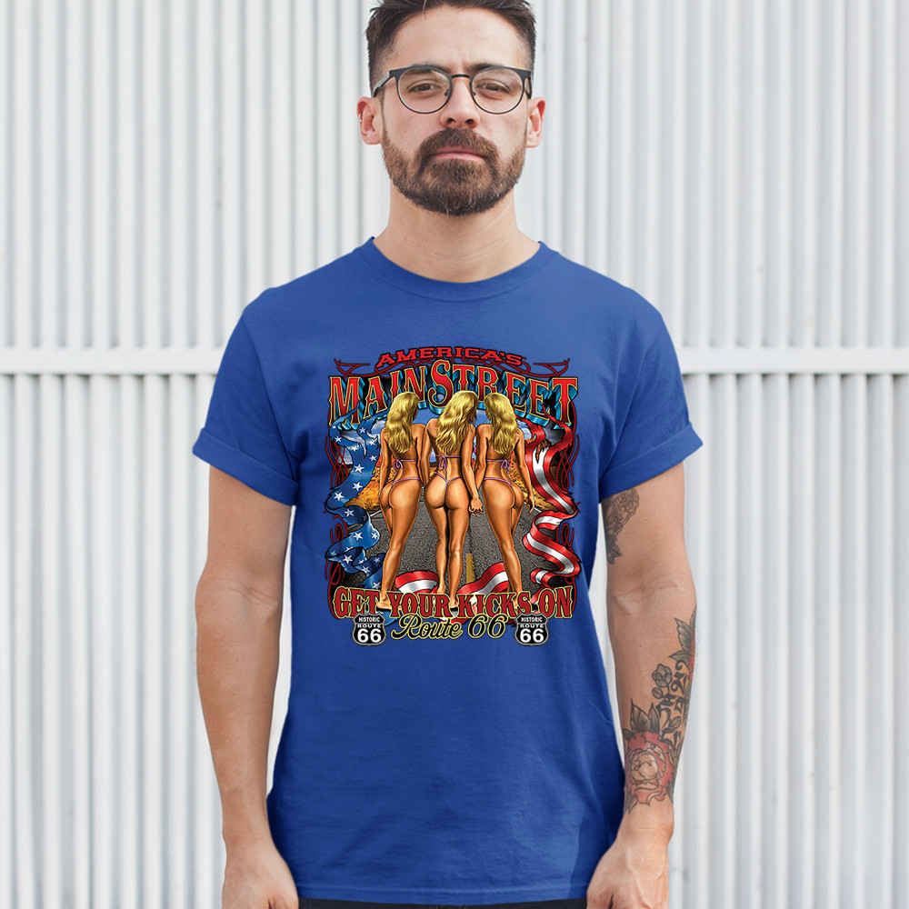 A print featuring three scantily-clad blondes holding each other's hands walking on a highway. The print says: "America's Main Street, Get Your Kicks on Route 66" and also features a ribbon with stars and stripes on it and two "Historic Route 66" signs. A
