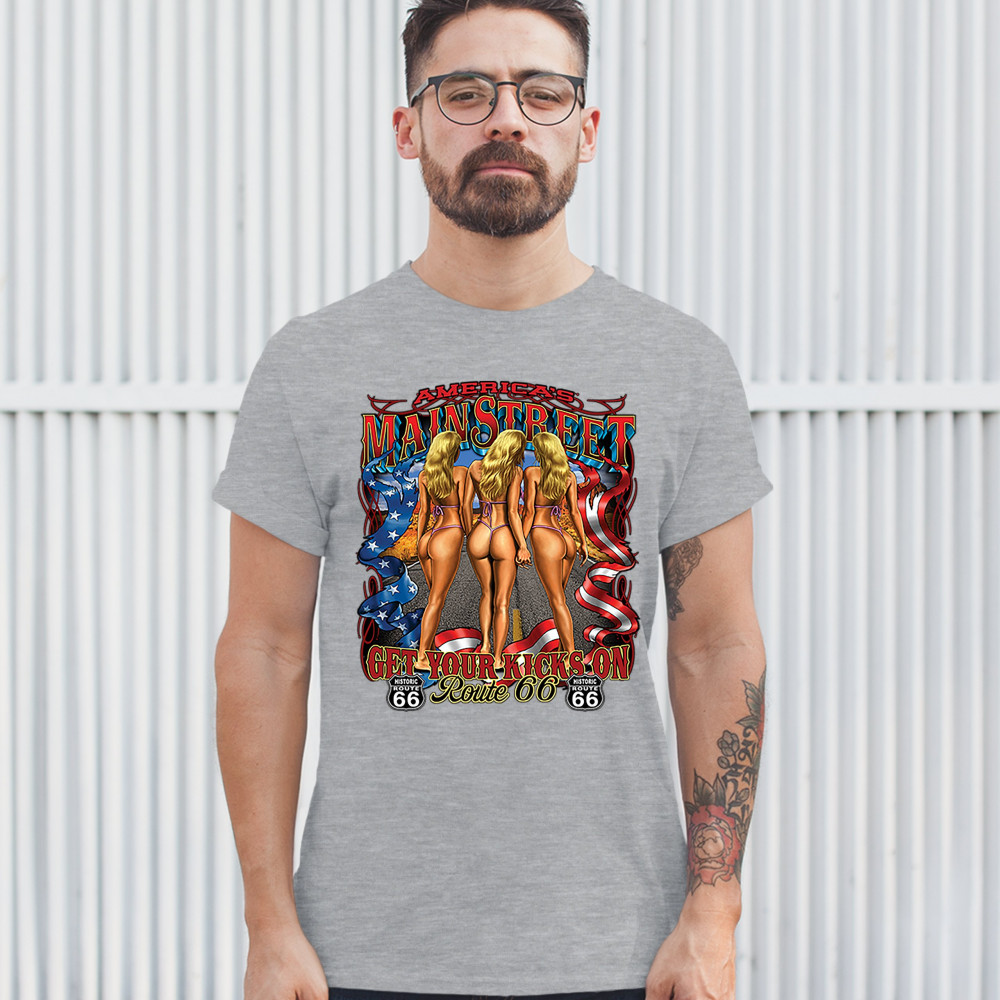 A print featuring three scantily-clad blondes holding each other's hands walking on a highway. The print says: "America's Main Street, Get Your Kicks on Route 66" and also features a ribbon with stars and stripes on it and two "Historic Route 66" signs. A