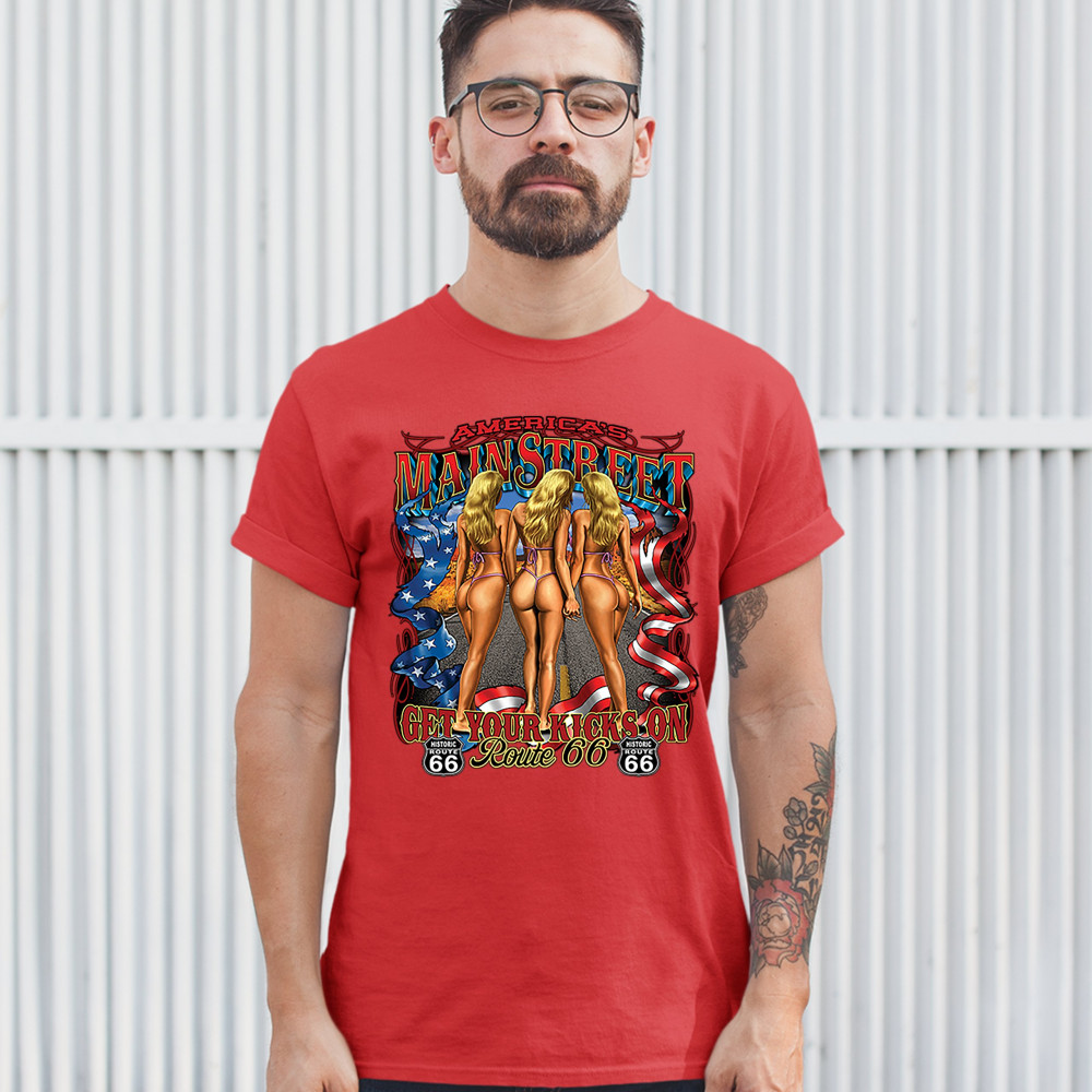 A print featuring three scantily-clad blondes holding each other's hands walking on a highway. The print says: "America's Main Street, Get Your Kicks on Route 66" and also features a ribbon with stars and stripes on it and two "Historic Route 66" signs. A