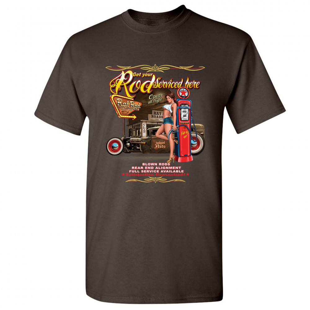 A print featuring a sexy pin-up girl leaning on a gas pump. There is a hot rod behind her and a "Rat Rod Roudhouse" in the background. The print also includes a bunch of innuendos: "get your rod serviced here, blown rods, rear end alignment, full service
